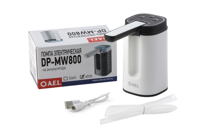 Электрическая помпа на аккумуляторе AEL DP-MW800. Подходит для бутыли 18,9л. Световая индикация. Один мотор. Складной носик. Несколько режимов работы: вкл/выкл, 15сек, 60сек. Цвет белый. Размер помпы: 138 х 78 х 78 мм. Размер в упаковке (1шт): 140 х 80 х 80 мм Комплектация: type-C кабель для зарядки аккумулятора, силиконовая трубка забора воды, инструкция. Напряжение 5В. Мощность 5 ватт. Аккумулятор:800mAh Страна происхождения: Китай