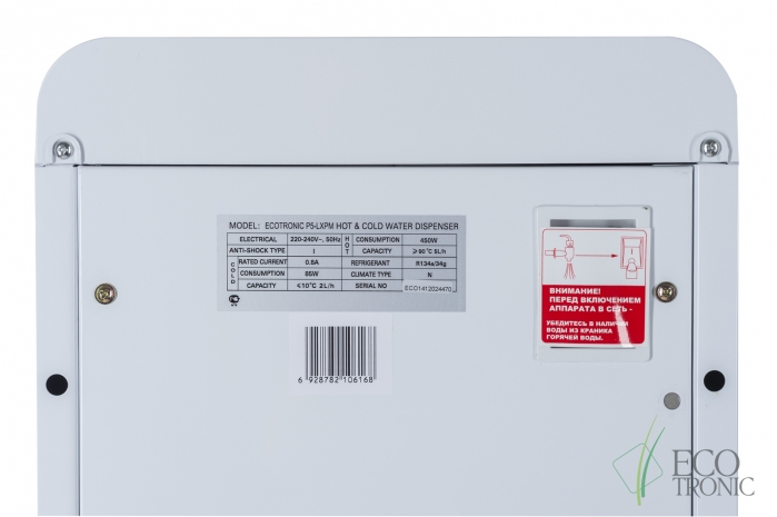 Ecotronic P5-LXPM white - кулер с нижней загрузкой бутыли. Температурный монитор с управлением. Краны нажим кружкой. Горячий кран с защитой от случайного нажатия (защита от детей).