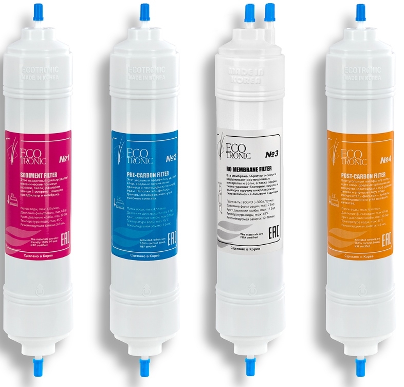 Комплект сменных фильтров с повышенным ресурсом для пурифайеров с обратно-осмотической мембраной (RO). Подобные пурифайеры маркируются после дефиса xx-R4L, где xx - серия и номер модели, R - мембрана обратного осмоса, 4-ступеней очистки, L - напольный.