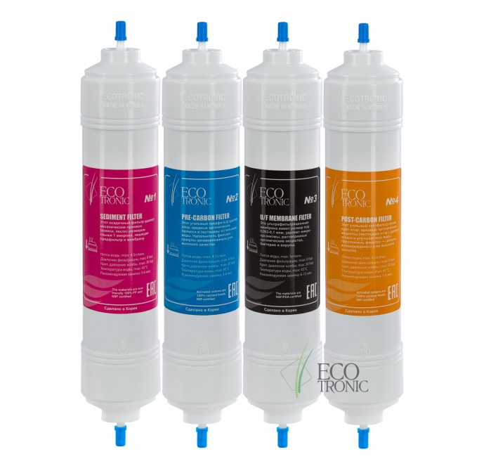 Комплект сменных фильтров (картриджей) с повышенным ресурсом для пурифайеров с ультра-фильтрационной мембраной (UF). Подобные пурифайеры маркируются после дефиса xx-U4L, где xx - серия и номер модели, U - ультрафильтрация, 4-ре ступени очистки, L - напольный.