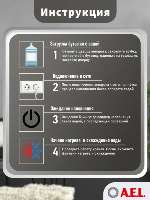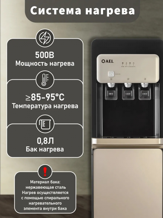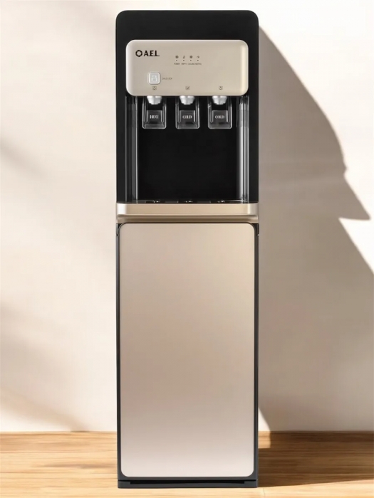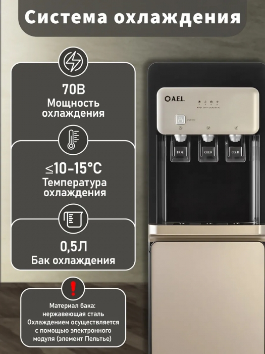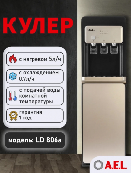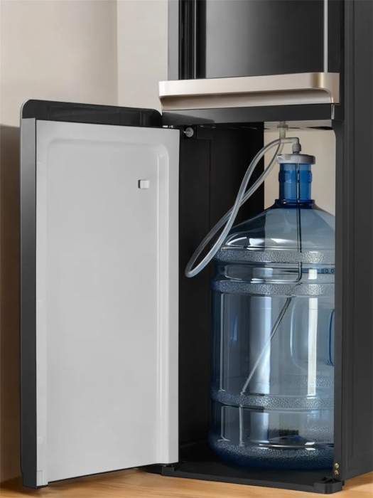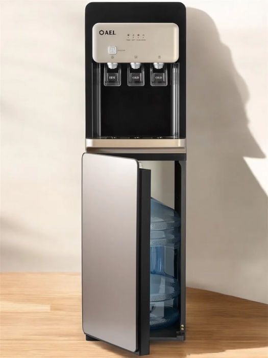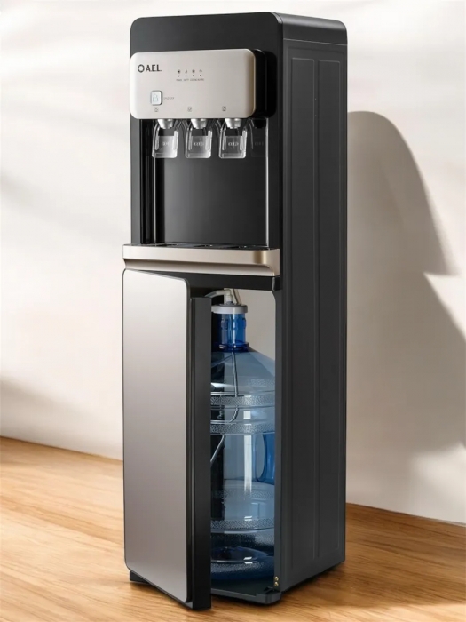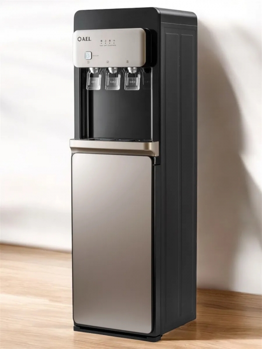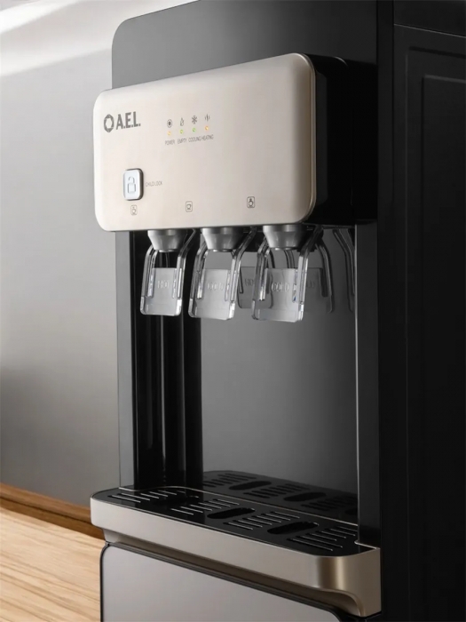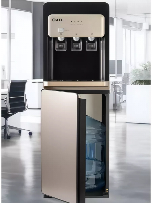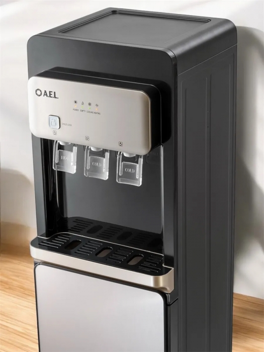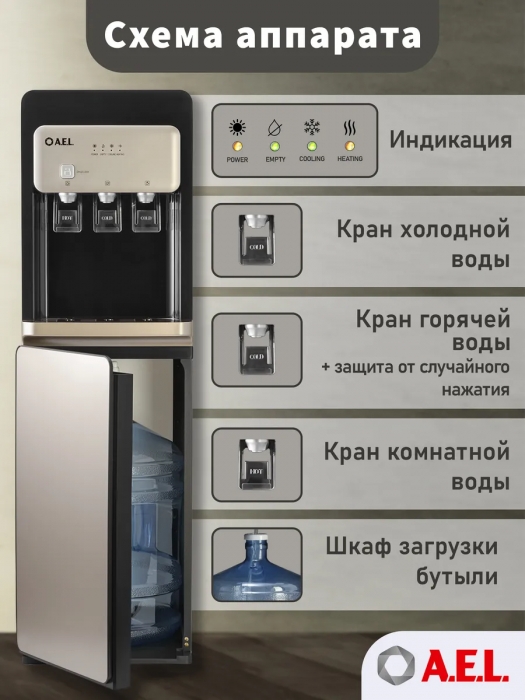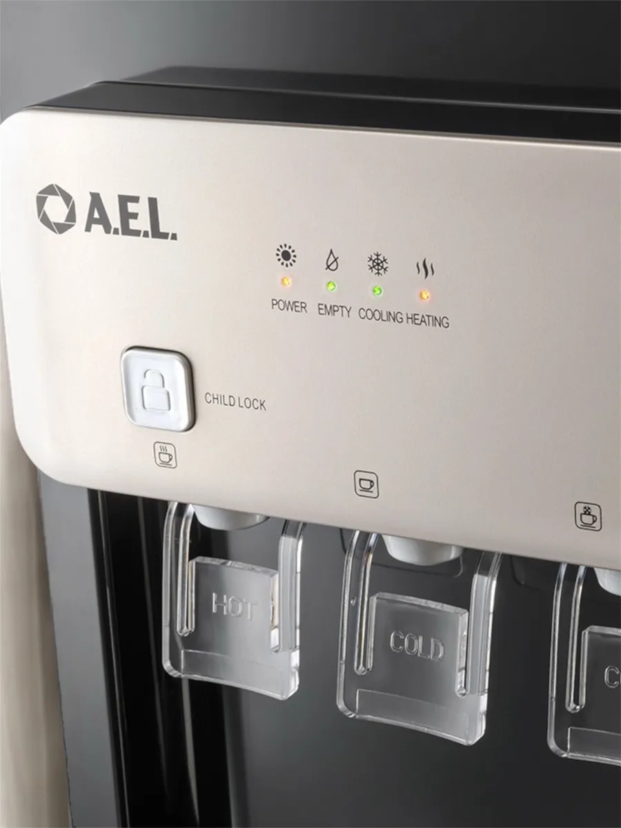 Новинка в ассортименте АЕЛ - кулер с нижней загрузкой бутыли с электронным охлаждением. Цвет: черный с золотистой вставкой. Модель оснащена тремя краниками нажим кружкой (горячая/комнатная/холодная). Стоит защита на кране горячей воды.