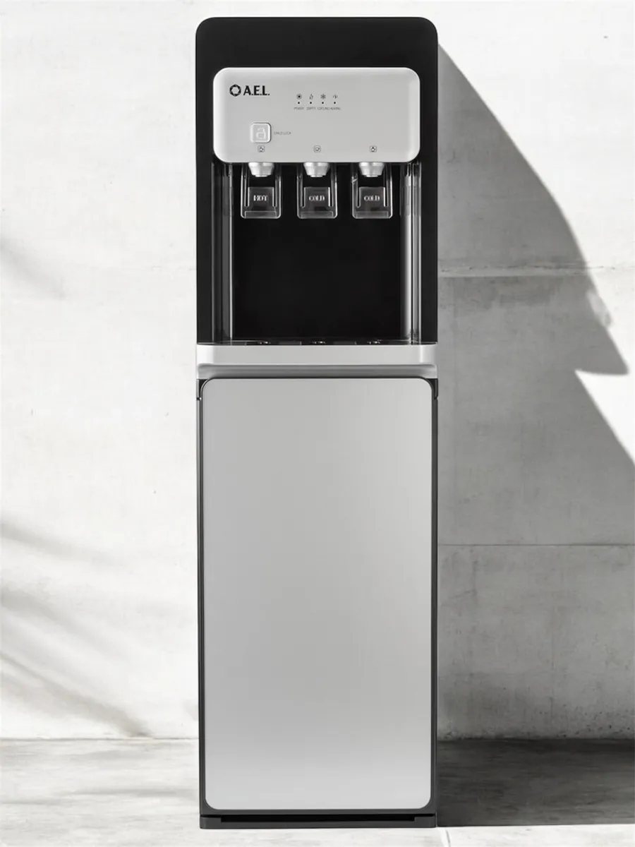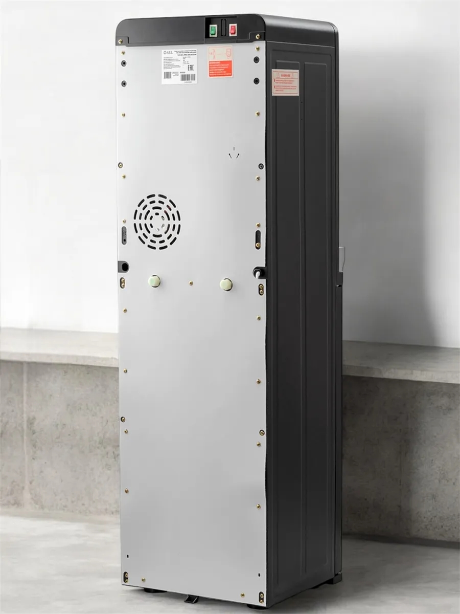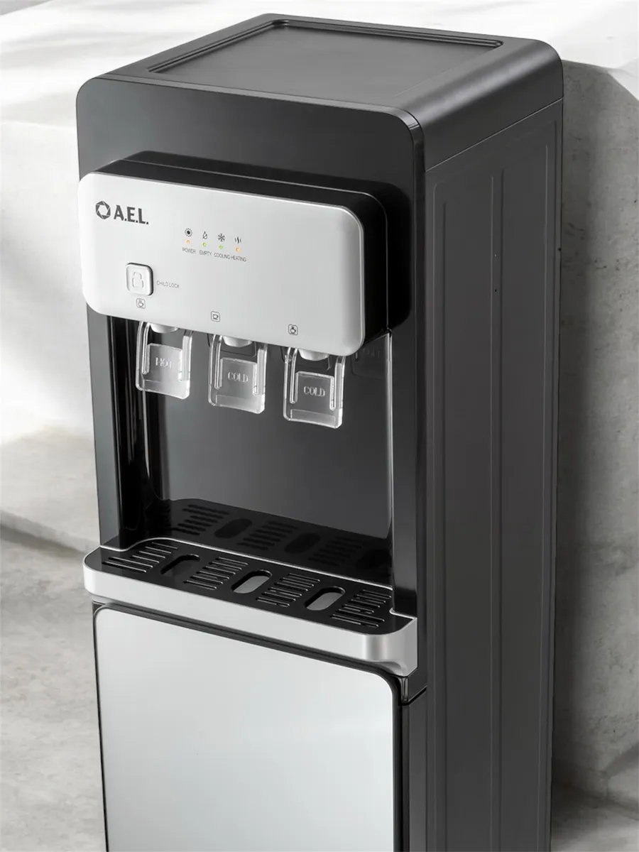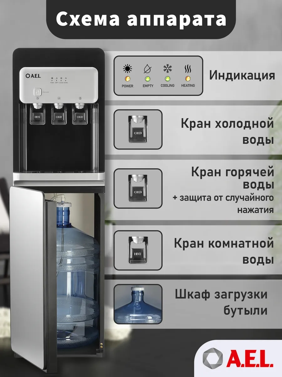 Новинка в ассортименте АЕЛ - кулер с нижней загрузкой бутыли с электронным охлаждением. Цвет: черный с серебряной вставкой. Модель оснащена тремя краниками нажим кружкой (горячая/комнатная/холодная). Стоит защита на кране горячей воды.