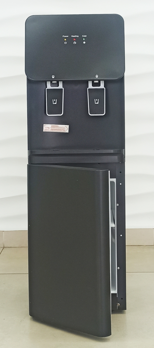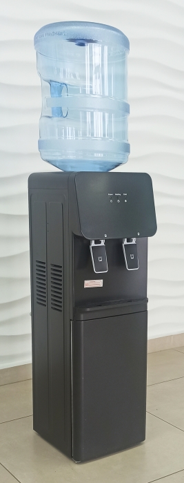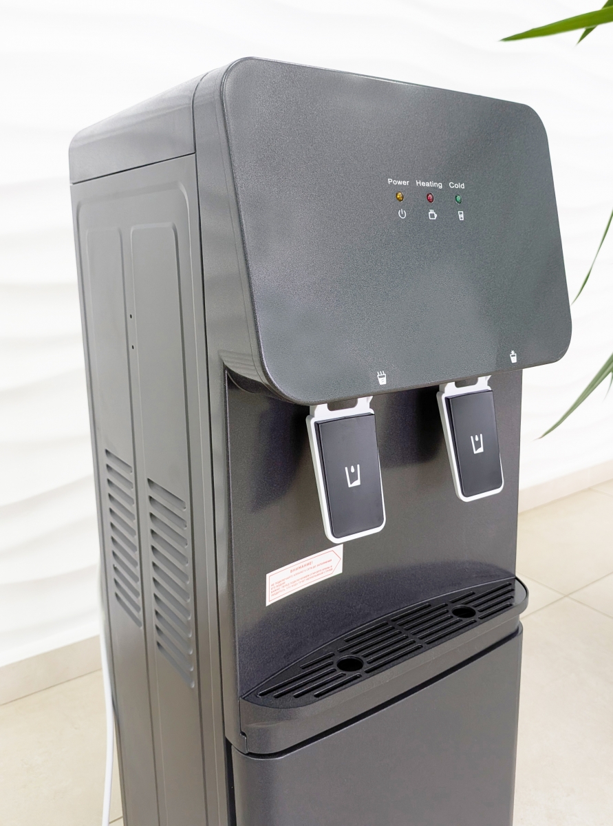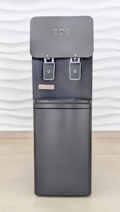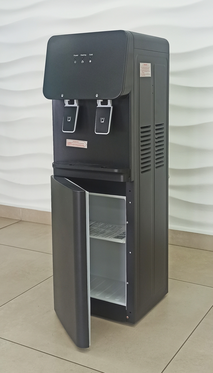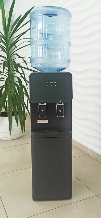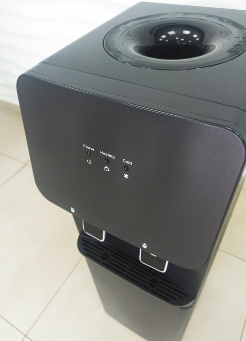 Компактный кулер для воды с функциями нагрева и охлаждения. С небольшим шкафчиком в нижней части. Электронное охлаждение. Матовый корпус черного цвета. Индикация режимов нагрева, охлаждения и готовности воды. Краны «нажим кружкой».