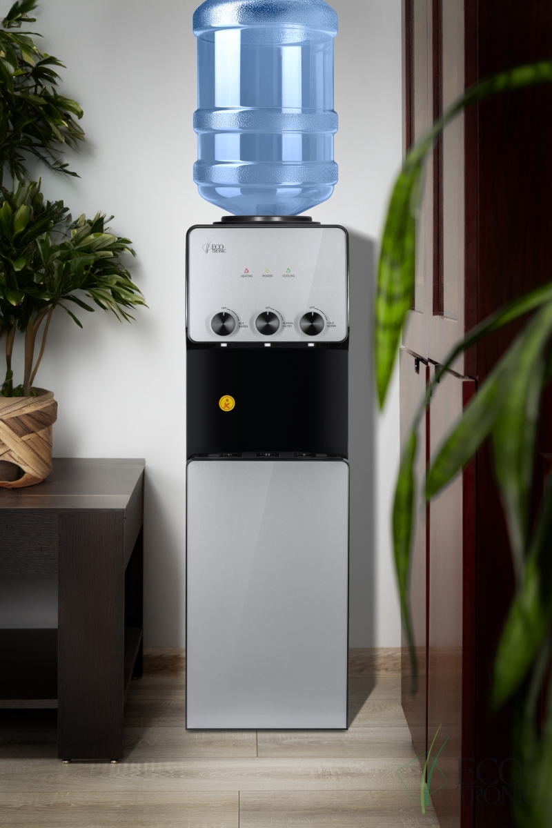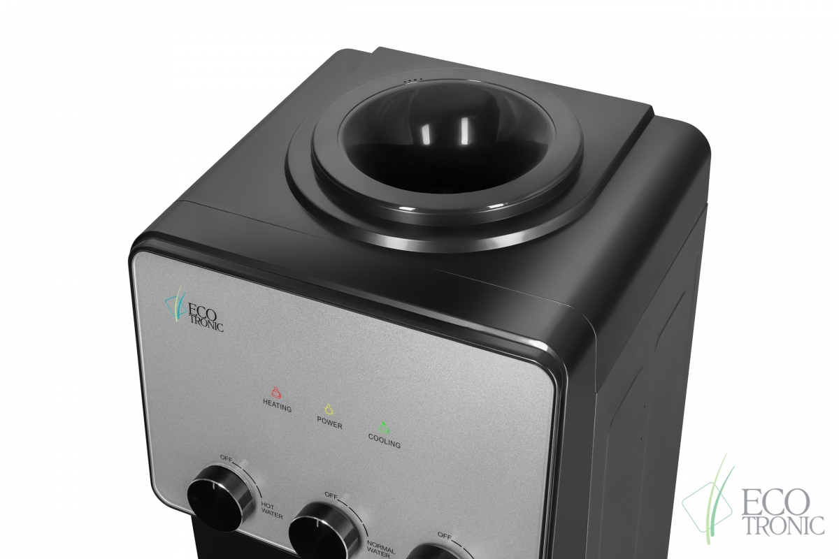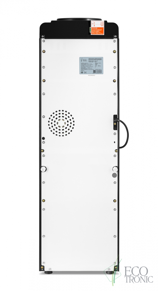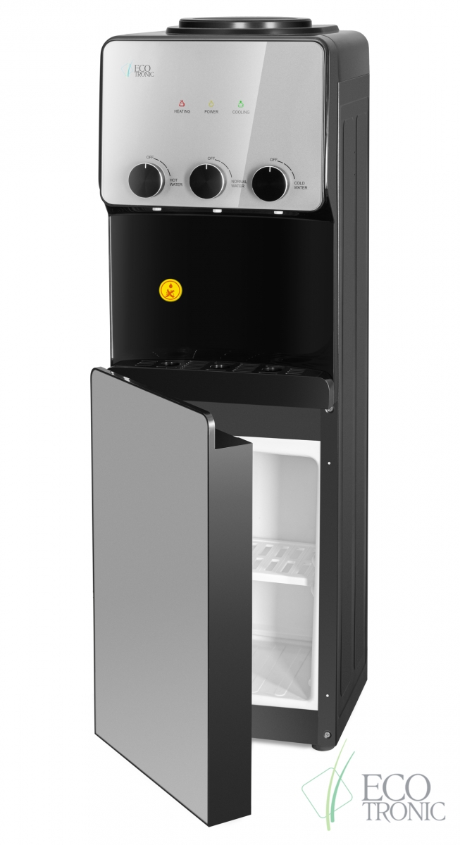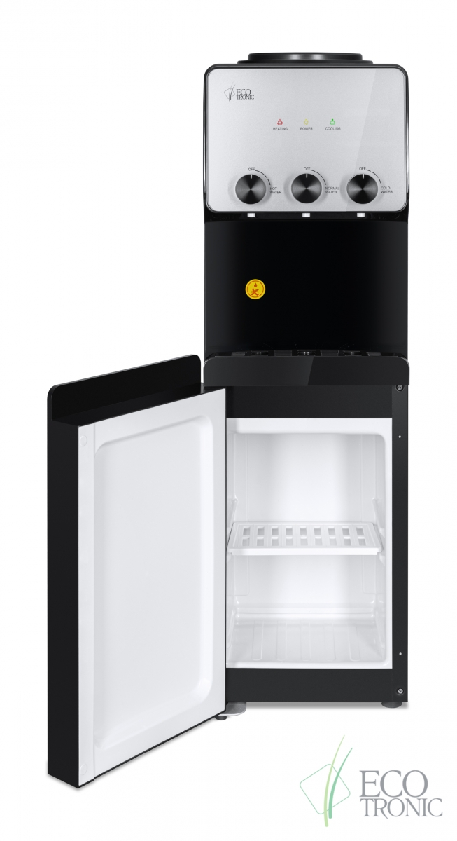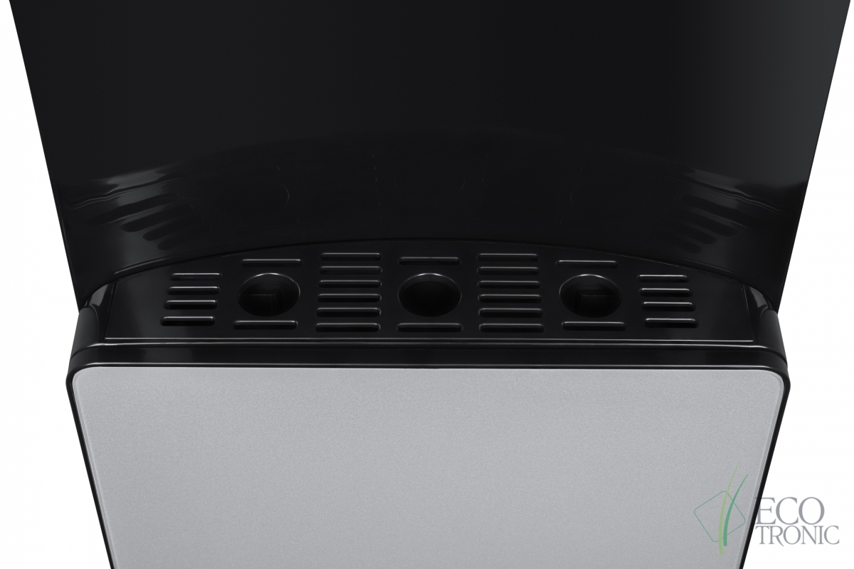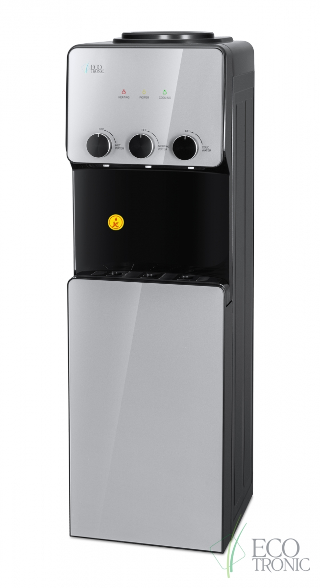 Напольный кулер с электронным охлаждением и вместительным шкафчиком в нижней части. Три крана поворотного типа: для подачи горячей воды, холодной и комнатной температуры. Для подачи воды нужно повернуть соответствующий кран, для остановки подачи — вернуть его в исходное положение. Корпус полностью чёрного цвета, верхняя панель с индикаторами и нижняя передняя панель (дверца шкафчика) со вставками из стекла серебристого цвета.