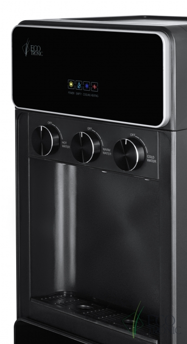 Необычный внешний вид кранов, стильный корпус и нижний отсек, в котором полностью скрывается бутыль, позволяют эффектно вписать этот кулер в современный интерьер с продуманным дизайном.