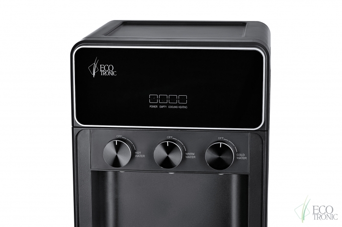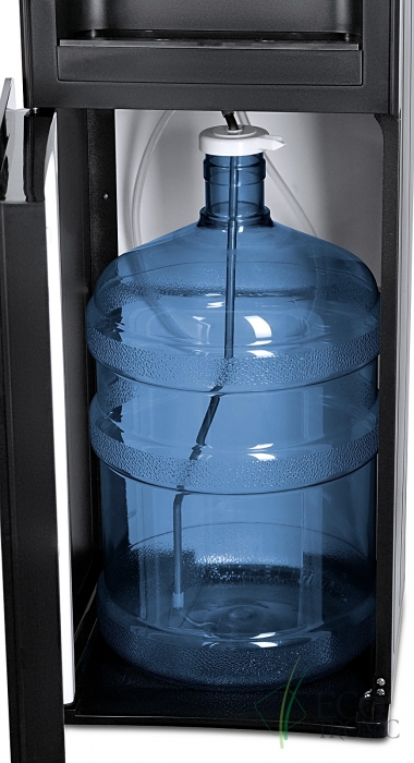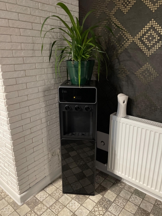Необычный внешний вид кранов, стильный корпус полностью черного цвета и нижний отсек, в котором полностью скрывается бутыль, позволяют эффектно вписать этот кулер в современный интерьер с продуманным дизайном.