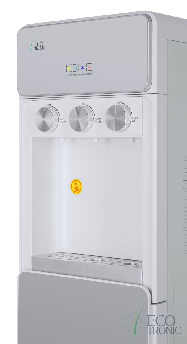Необычный внешний вид кранов, стильный корпус и нижний отсек, в котором полностью скрывается бутыль, позволяют эффектно вписать этот кулер в современный интерьер с продуманным дизайном.