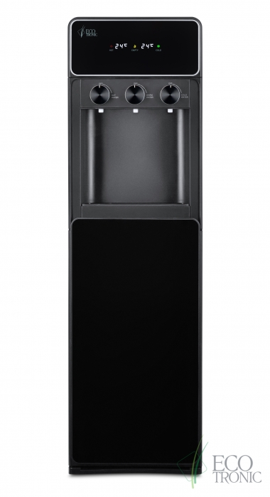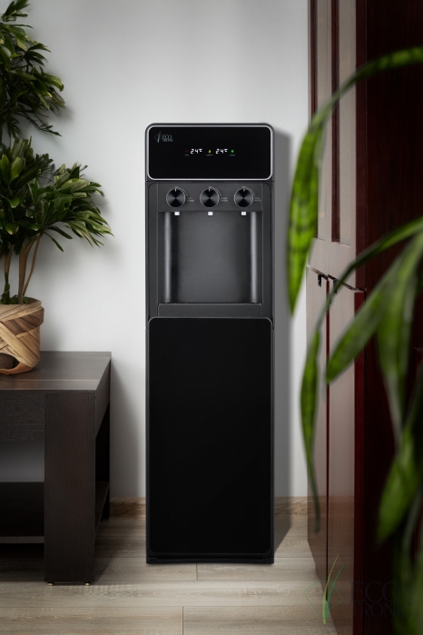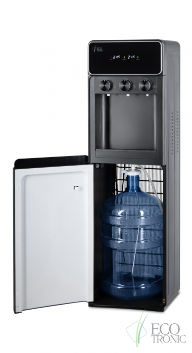 Напольный кулер с нижней загрузкой бутыли, монитором температуры и поворотными кранами подачи воды.