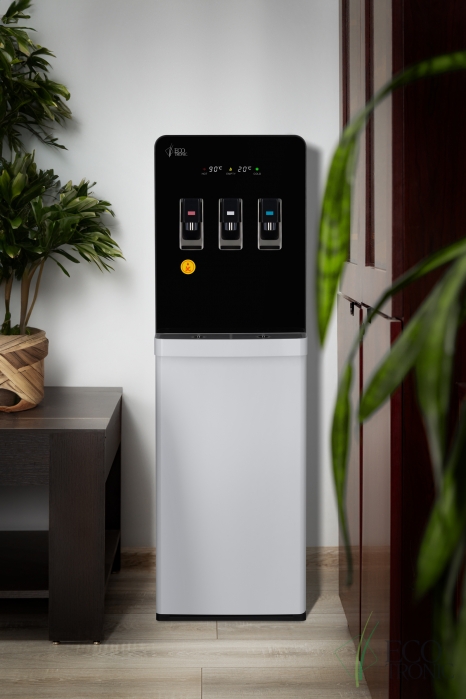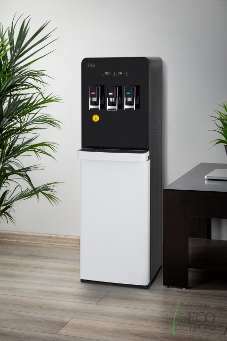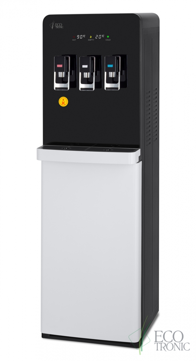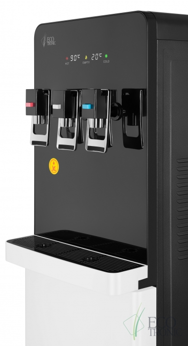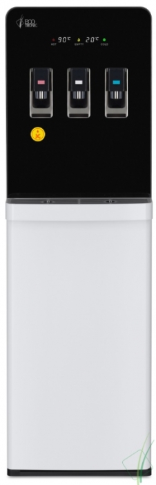 Модель с электронным охлаждением, со стандартной производительностью. Монитор в верхней части отображает температуру горячей и холодной воды в аппарате, а также индикаторы нагрева, охлаждения и необходимости заменить бутыль. Бак горячей воды с бандажным (внешним) нагревателем для работы с более жесткой водой и долговечности.