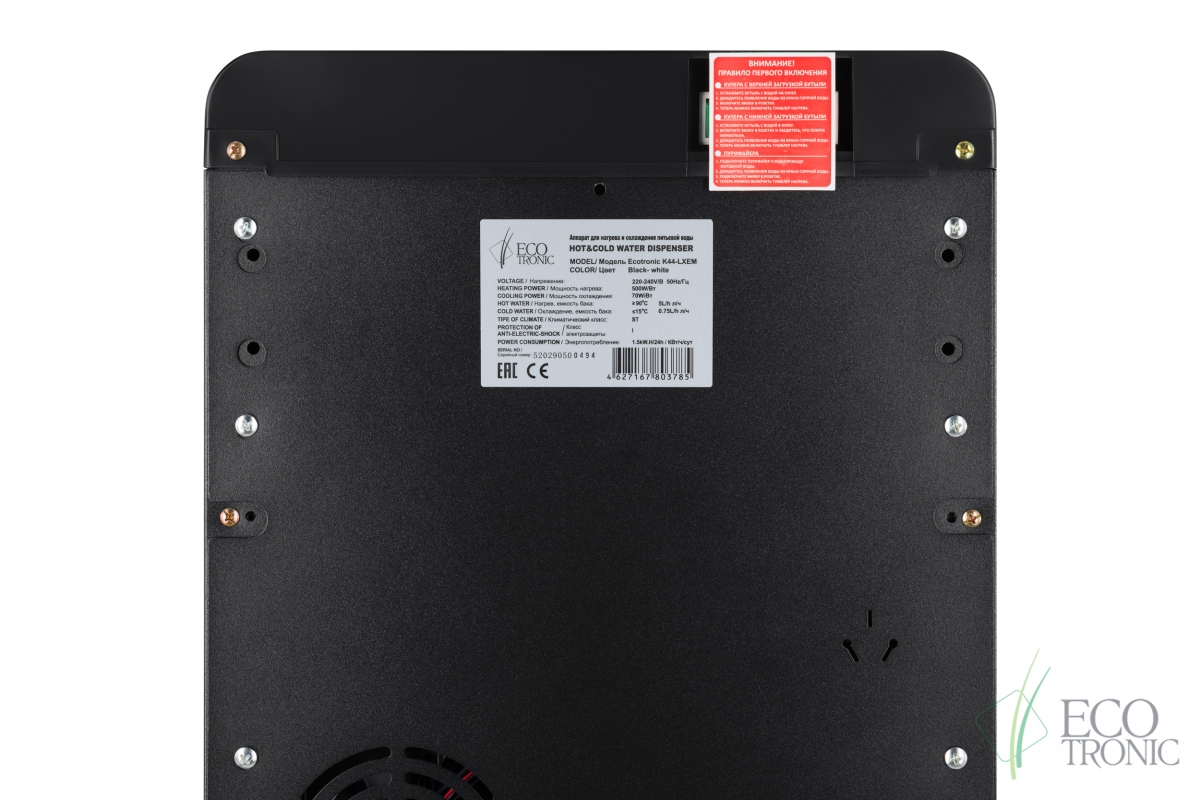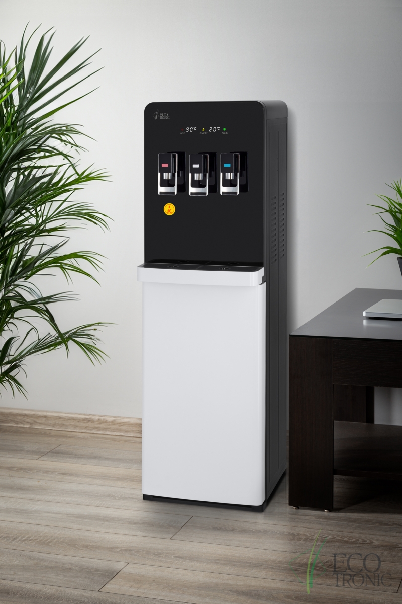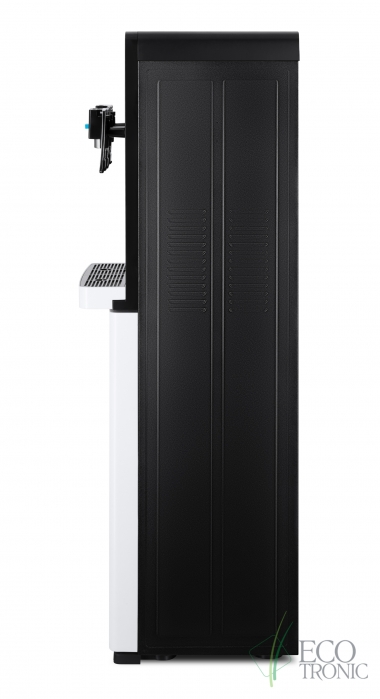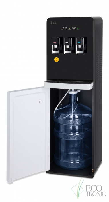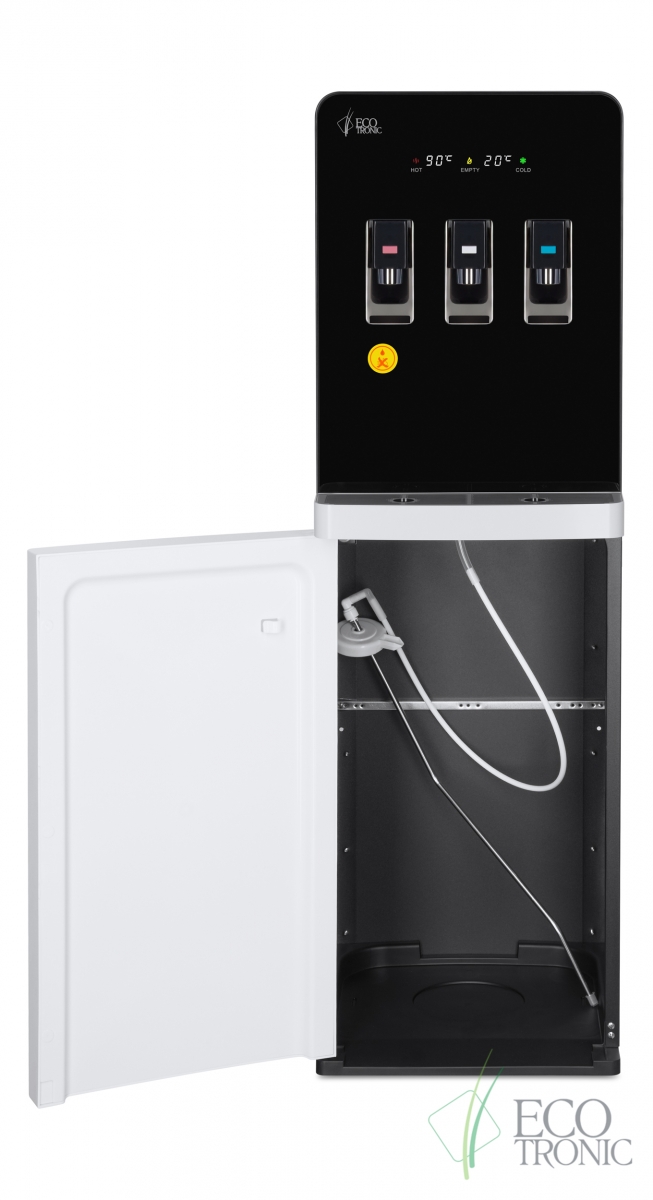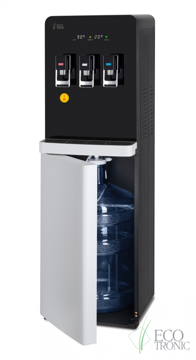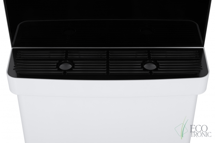 Эффектный дизайн позволяет вписать кулер в современный интерьер: бутыль с водой полностью скрыта в нижнем отсеке. Дверца отсека для бутыли и лоток водоприема белого цвета, при этом основной цвет корпуса — черный.