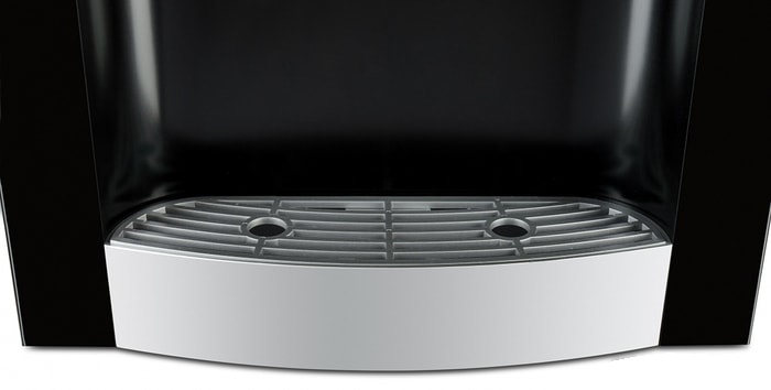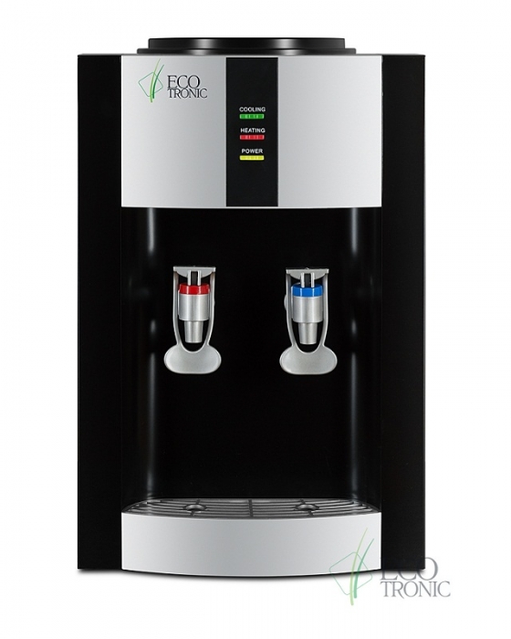 Настольный кулер с электронным охлаждением, цвет черный с серебристой вставкой. Тип кранов подачи воды - "Нажим кружкой". Одинарный блок охлаждения.