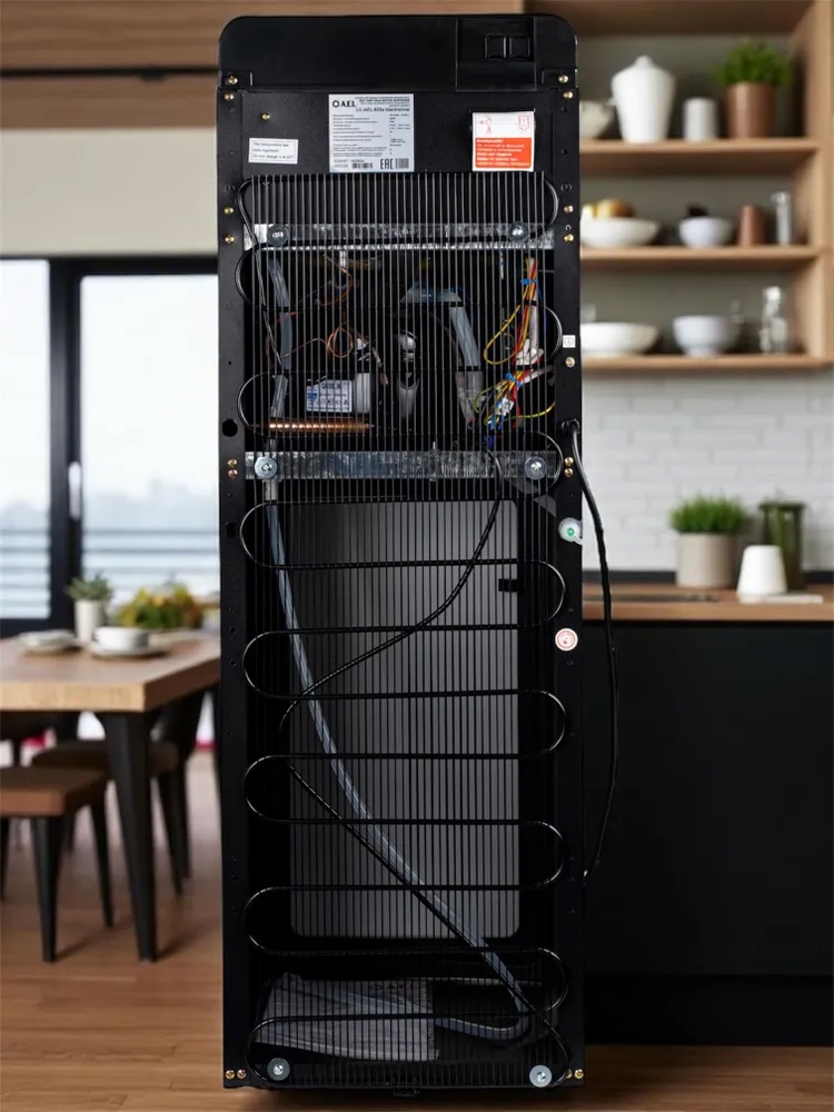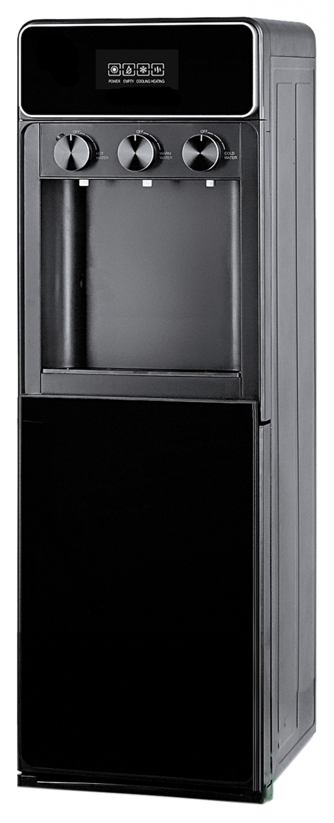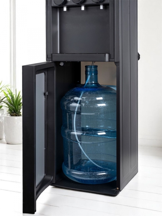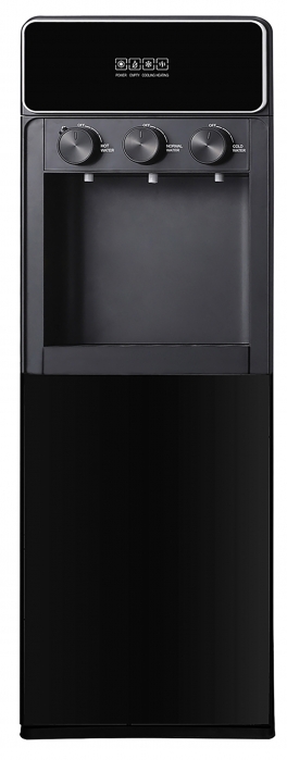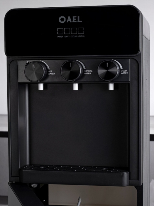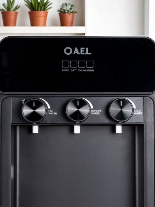Кулер для воды LC-AEL-825a full black - напольный кулер с нижней загрузкой бутыли, с компрессорным охлаждением и поворотными кранами подачи воды. Корпус полностью черного цвета. Три крана подачи воды: горячей, холодной и комнатной температуры. На кране горячей воды располагается кнопка от случайного нажатия. В процессе эксплуатации аппарата в тот момент, когда вода в бутыли закончилась, на панели индикации загорится индикатор наличия воды в бутыли. Это символизирует о том, что необходимо заменить пустую бутыль.