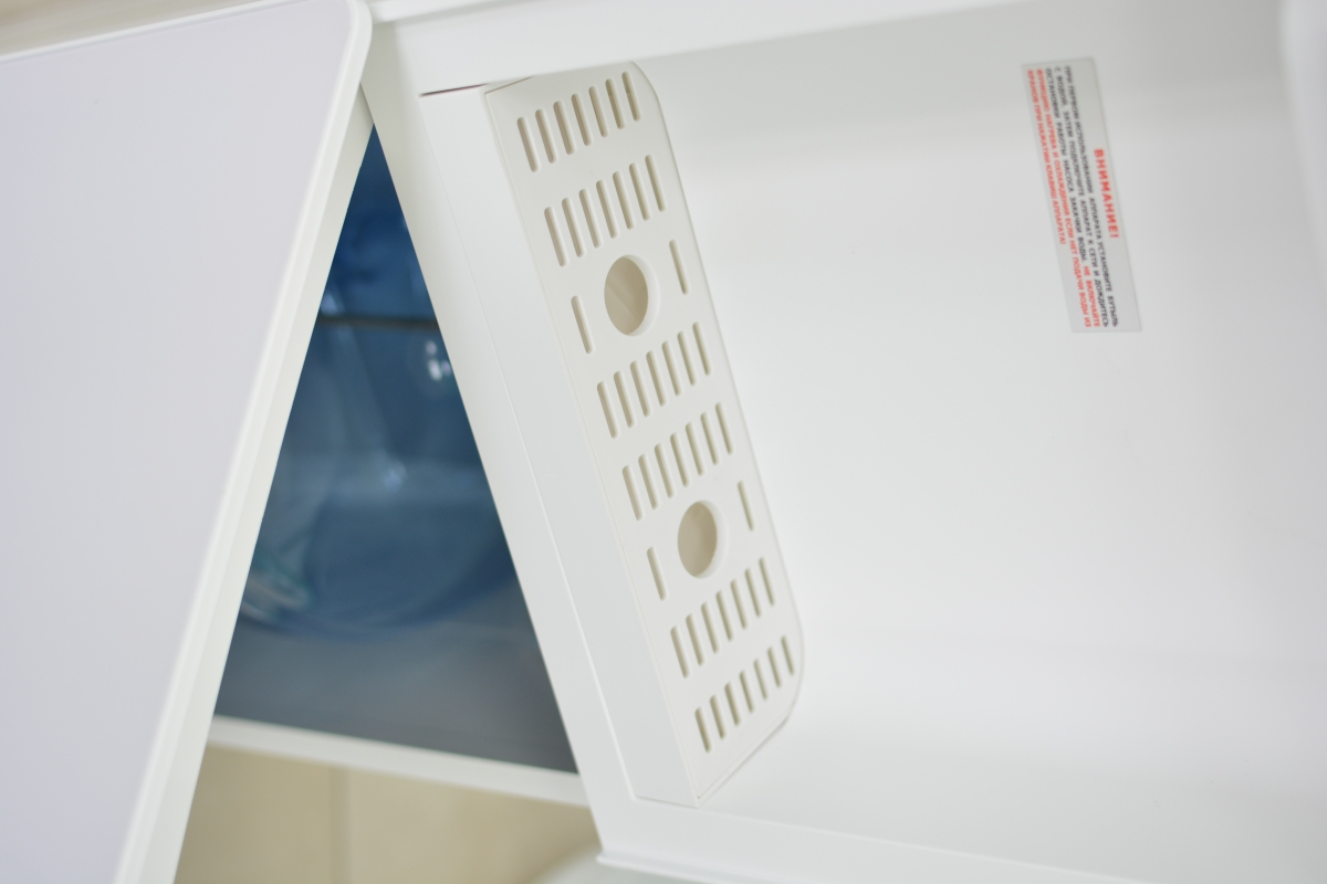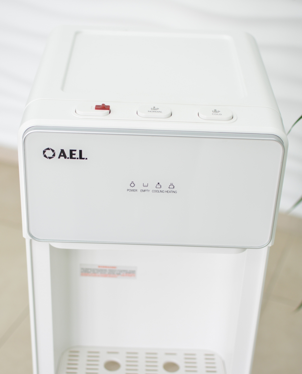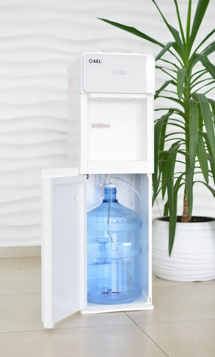 Стильный корпус полностью белого цвета и нижний отсек, в котором полностью скрывается бутыль, позволяют эффектно вписать этот кулер в современный интерьер с продуманным дизайном.