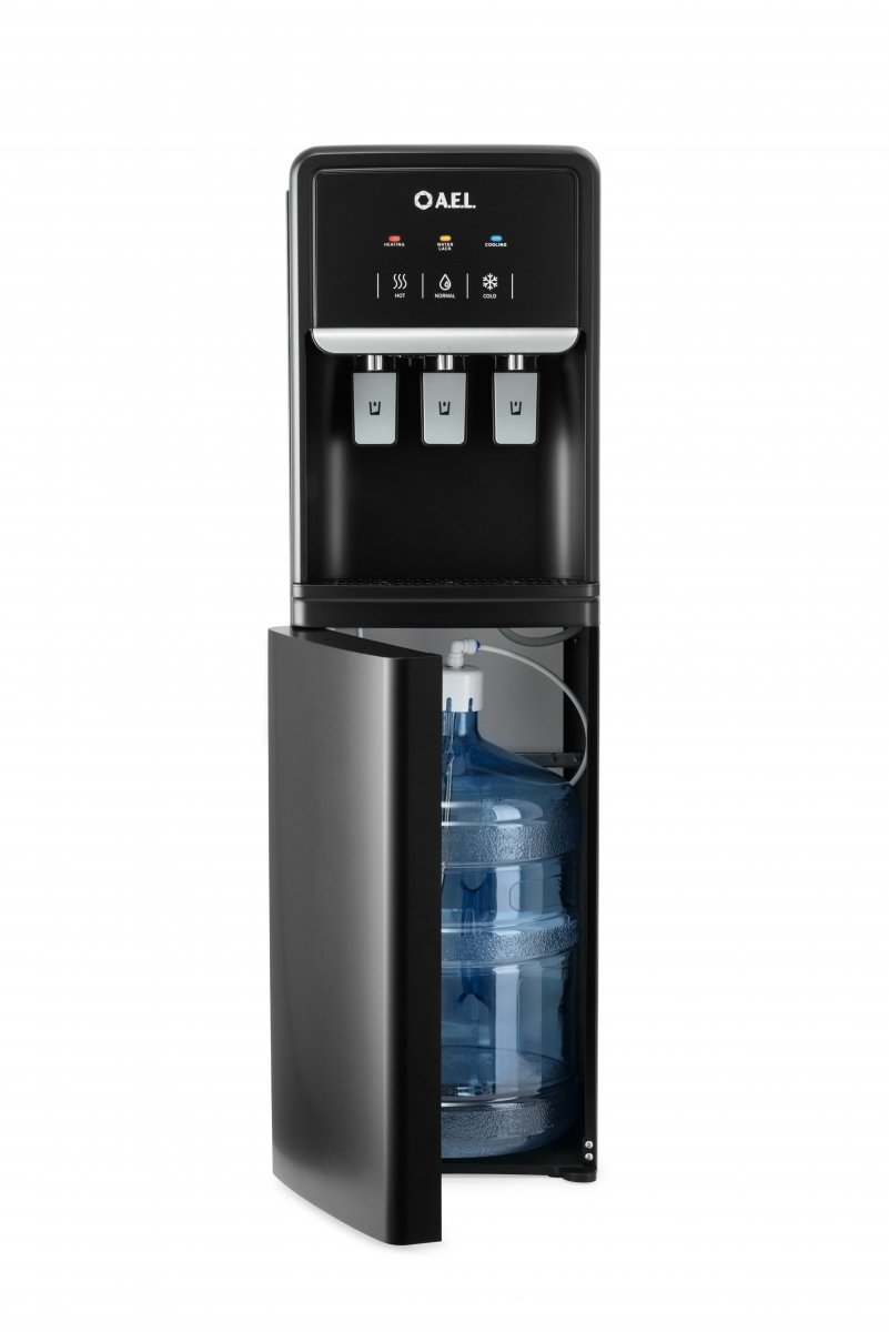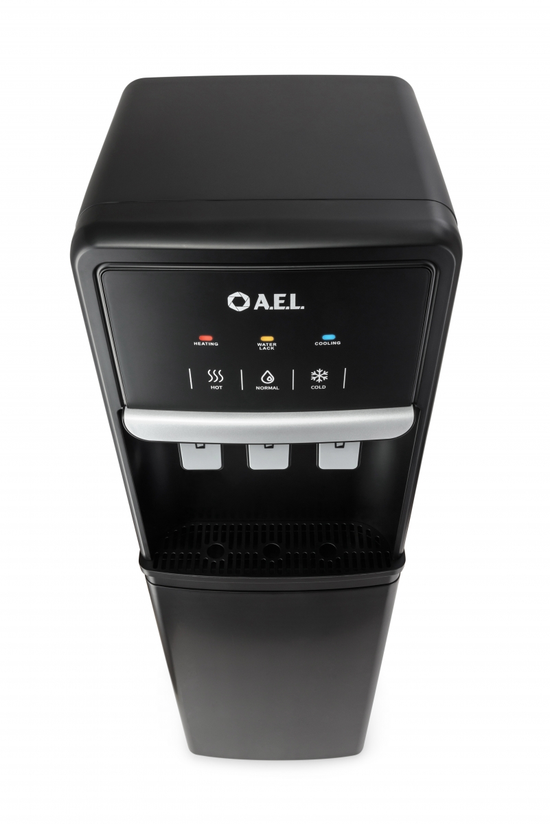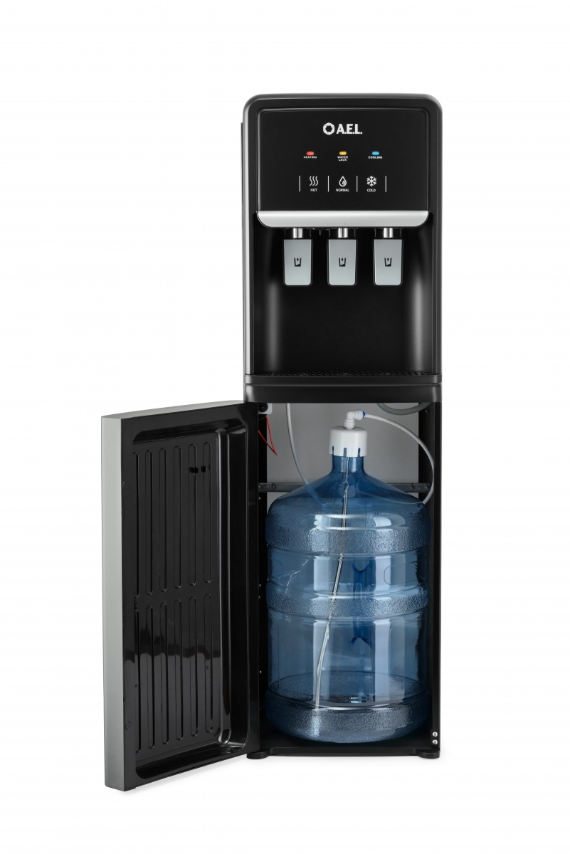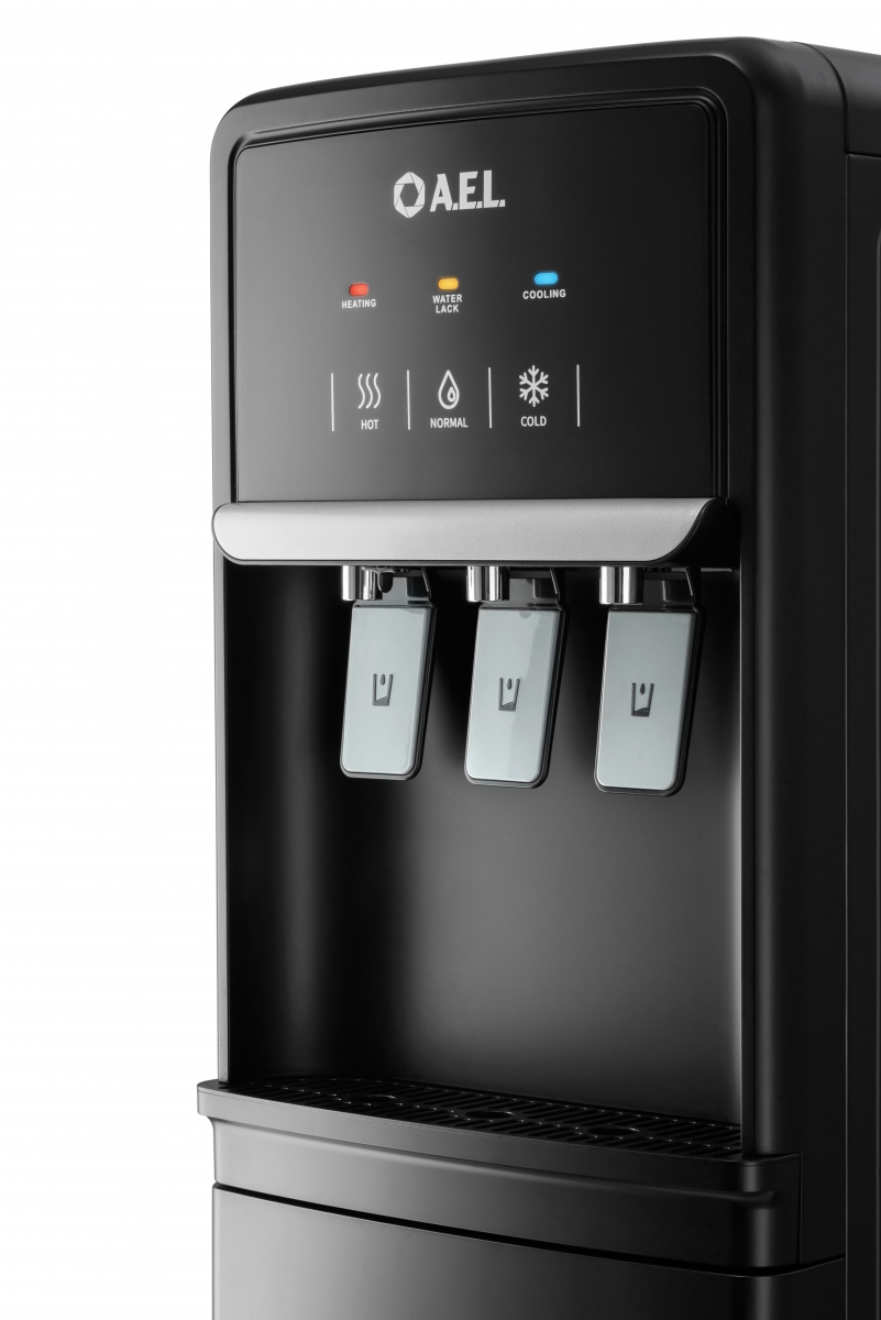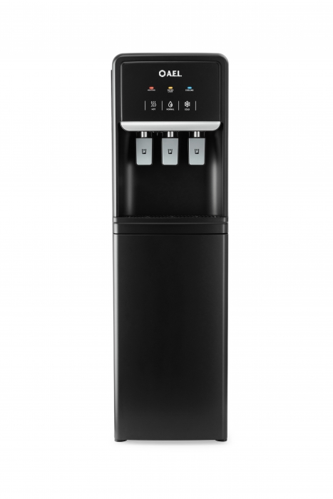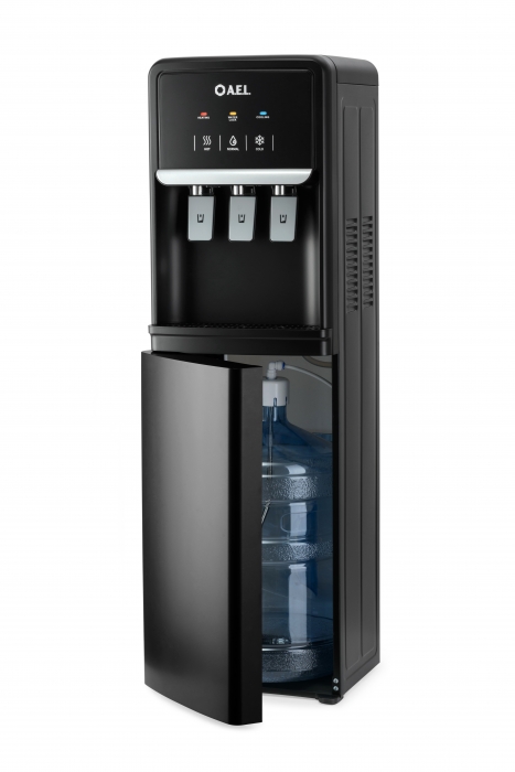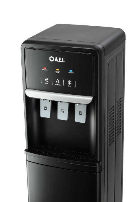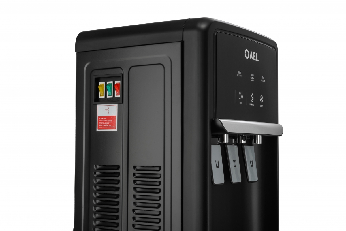Кулер для воды LD-AEL-815a black с нижней загрузкой бутыли и с электронным охлаждением. Три крана нажим чашкой. Горячая/прохладная/холодная вода на выходе.