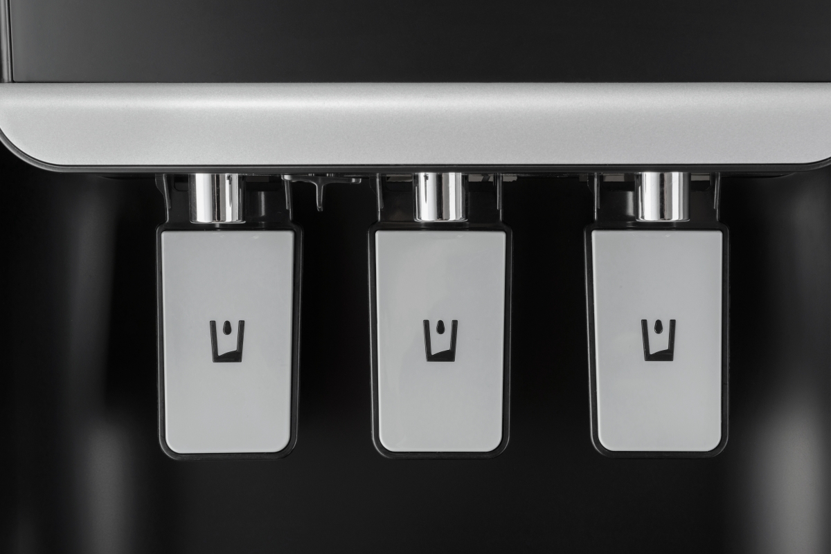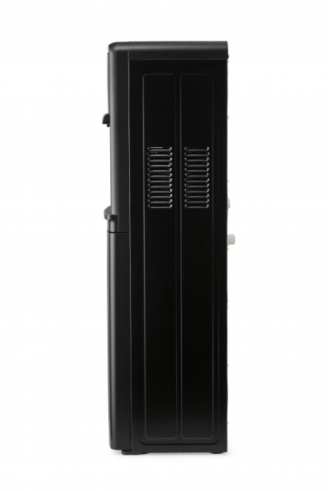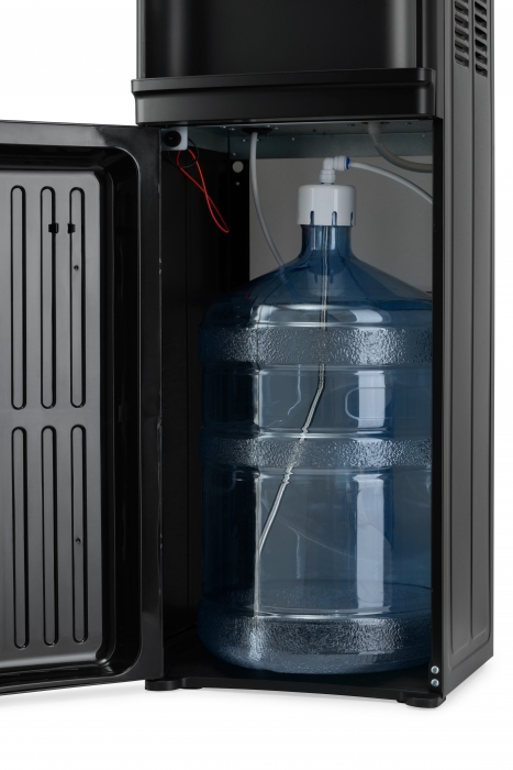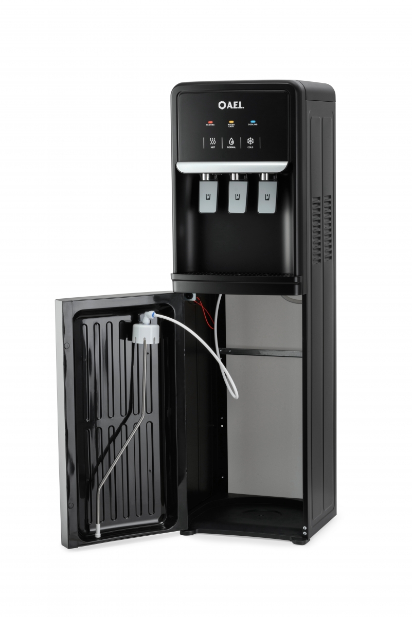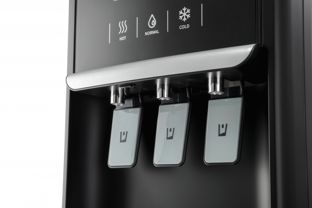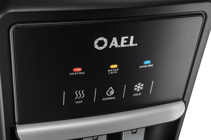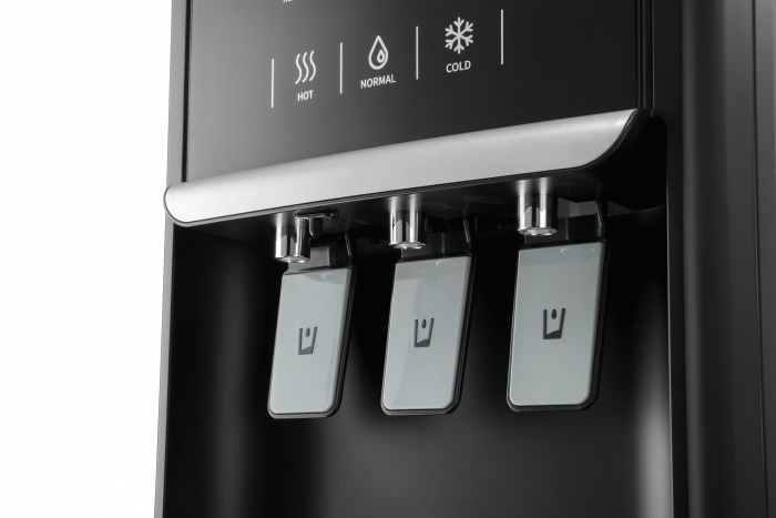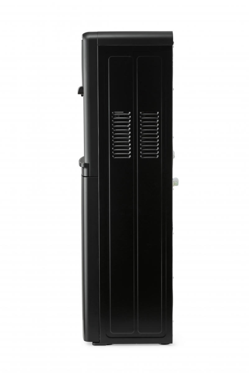 Кулер для воды LD-AEL-815a black с нижней загрузкой бутыли и с электронным охлаждением. Три крана нажим чашкой. Горячая/прохладная/холодная вода на выходе.