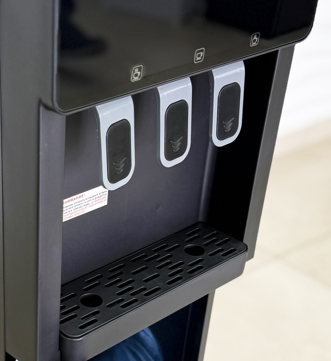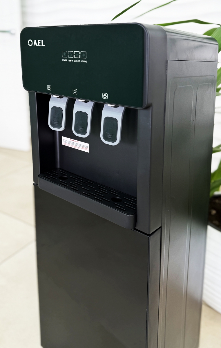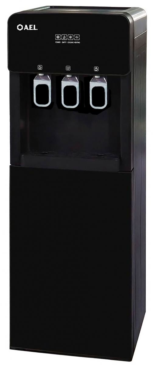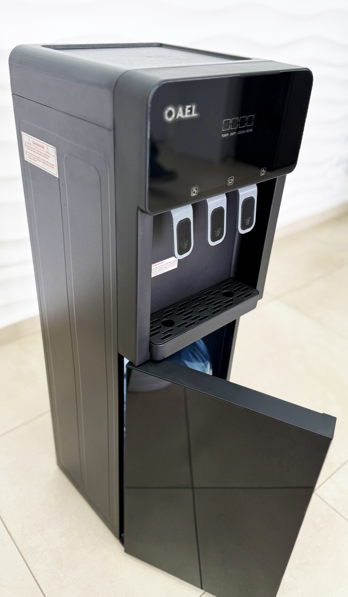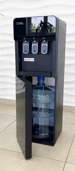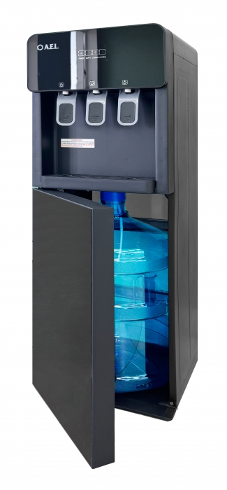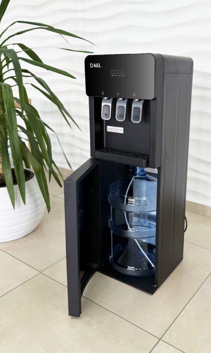 Кулер для воды с нижней загрузкой бутыли и с электронным охлаждением. Три крана нажим чашкой. Горячая/прохладная/холодная вода на выходе.