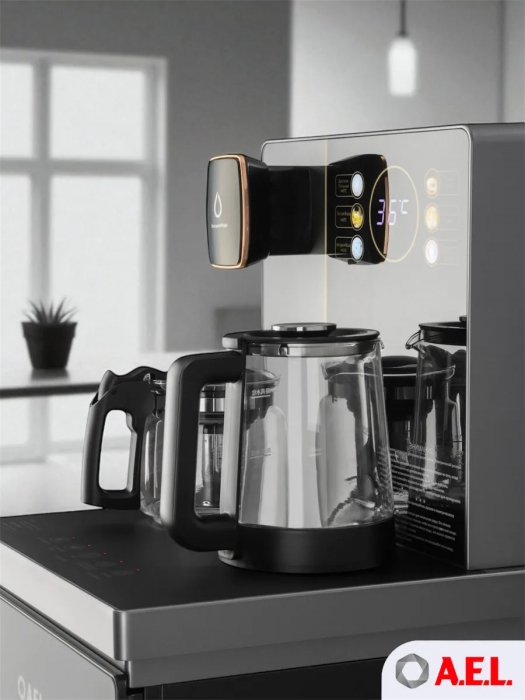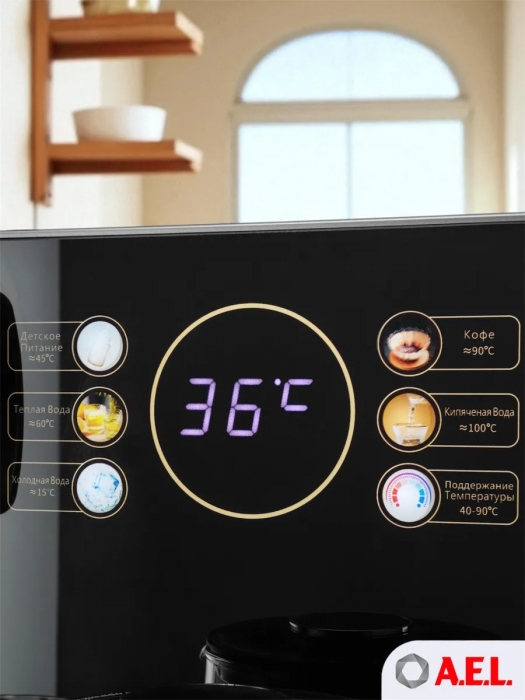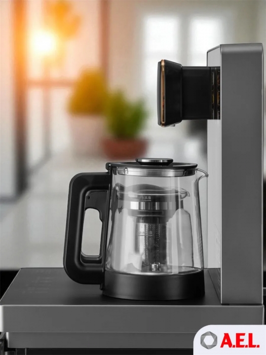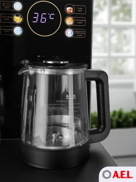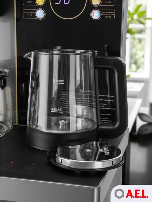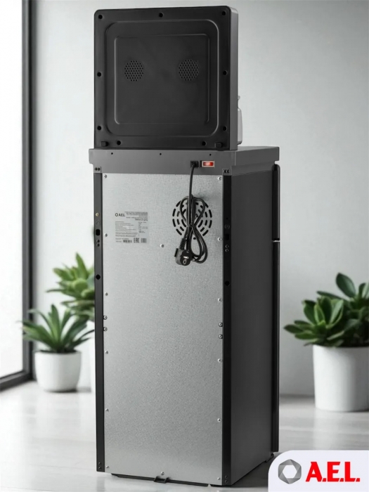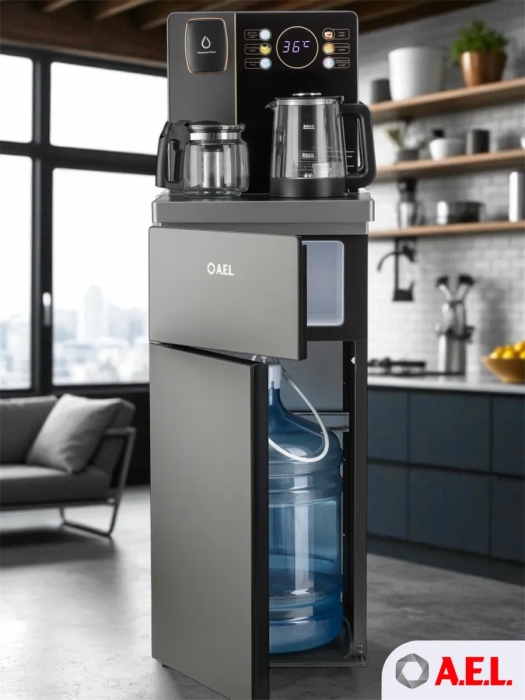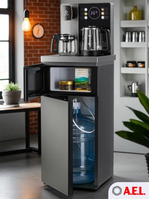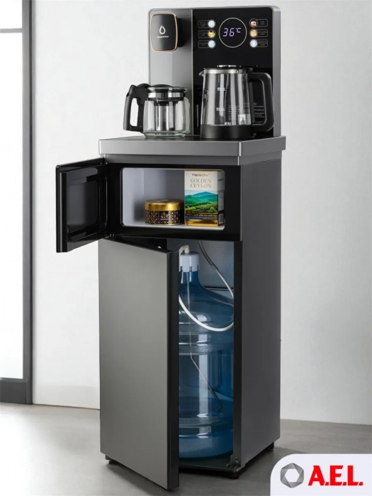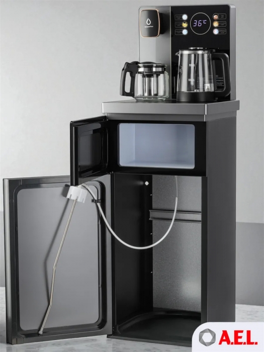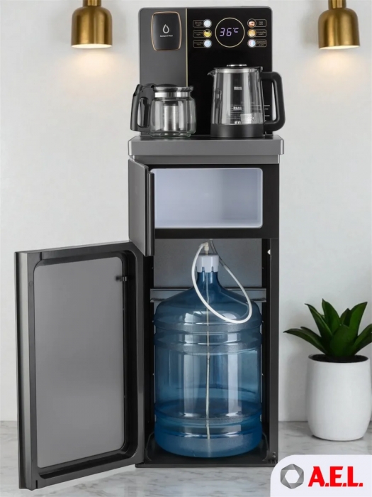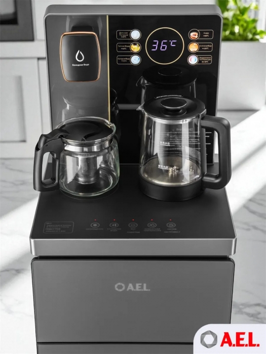 Чайный столик серого цвета TB83a-LD с электронным охлаждением. Нижняя загрузка бутыли. Управление с помощью сенсорной панели управления и сенсорных кнопок на столешнице. Шесть режимов нагрева воды, маркированные температурой: 45°С для детской молочной смеси, теплая вода 60°С, холодная вода 15°С, 90°С для кофе, 100°С кипяток, и функция поддержания температуры 40°-90°С. Уникальная система залива воды непосредственно в чайник снизу через клапан в столешнице. Функция подогрева. Чайники объемом 1л, Размер в собранном виде 370 x 340 x 1125мм