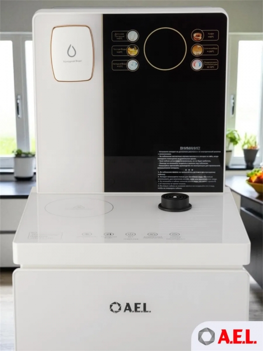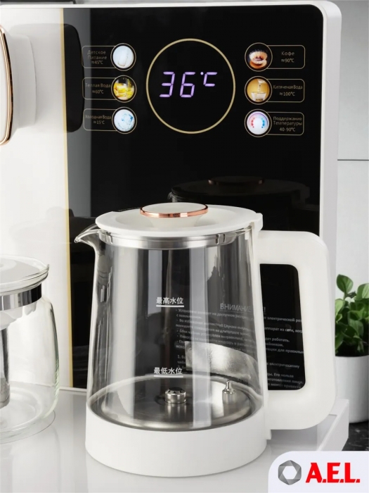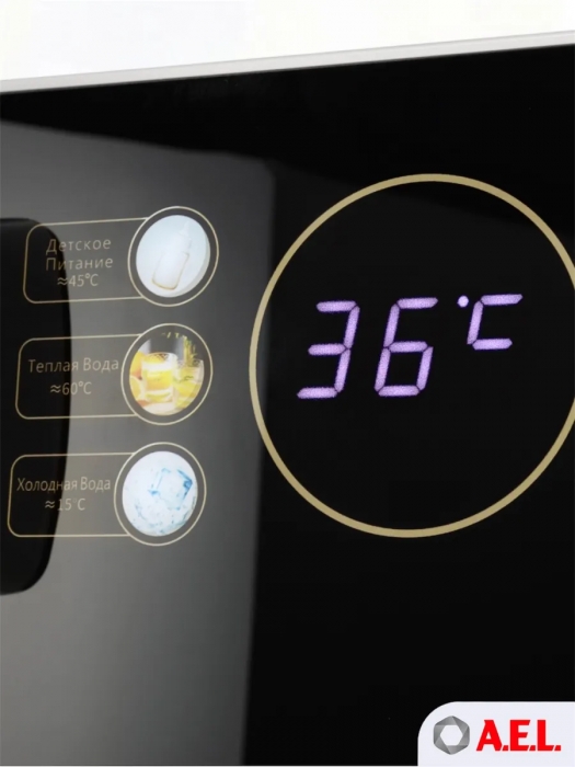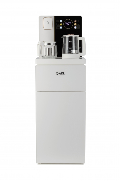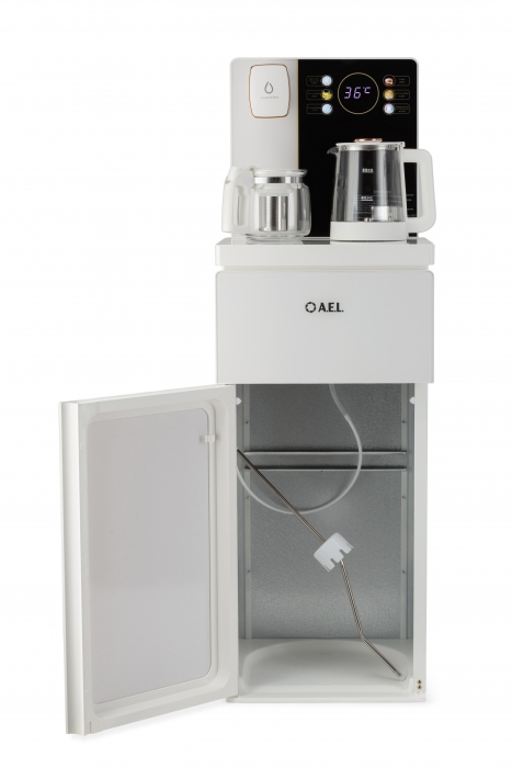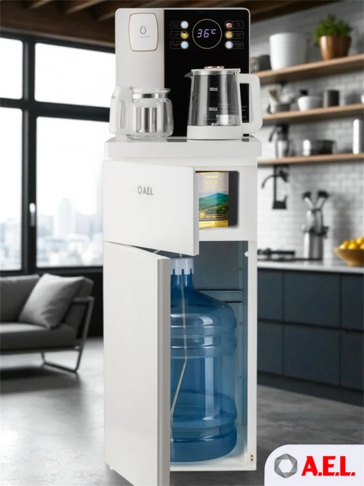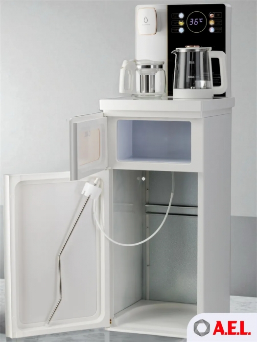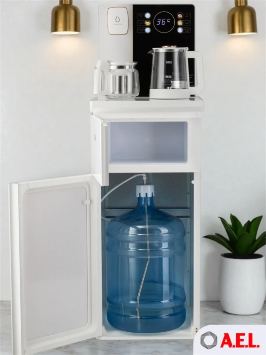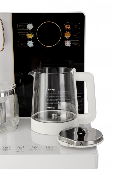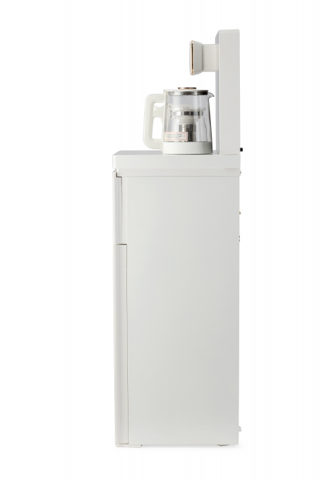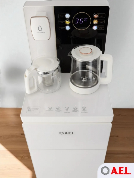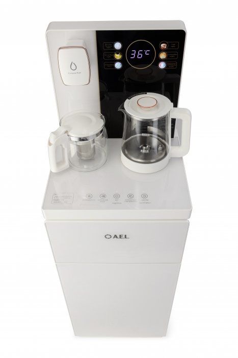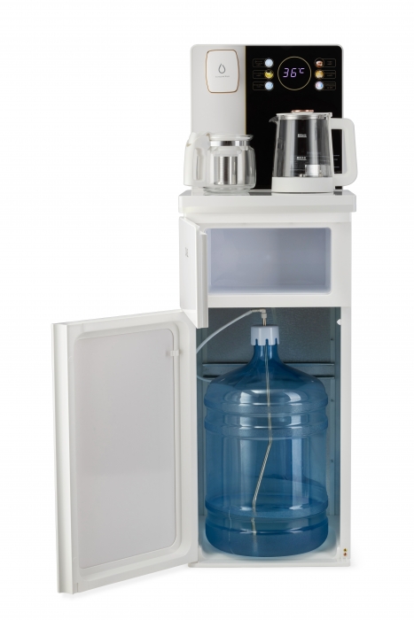 Чайный столик TB83a-LD с электронным охлаждением. Нижняя загрузка бутыли. Управление с помощью сенсорной панели управления и сенсорных кнопок на столешнице. Шесть режимов нагрева воды, маркированные температурой: 45°С для детской молочной смеси, теплая вода 60°С, холодная вода 15°С, 90°С для кофе, 100°С кипяток, и функция поддержания температуры 40°-90°С. Уникальная система залива воды непосредственно в чайник снизу через клапан в столешнице. Функция подогрева. Чайники объемом 1л, Размер в собранном виде 370 x 340 x 1125мм