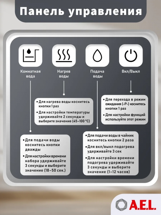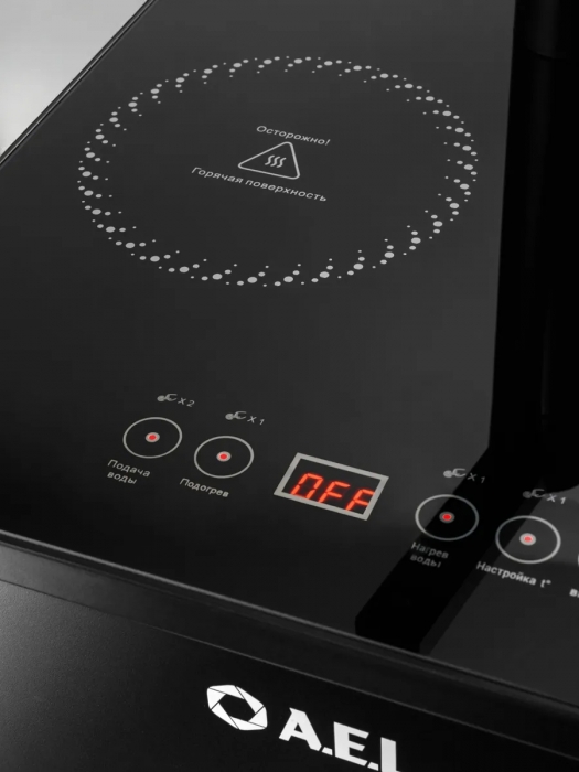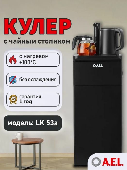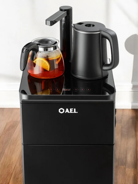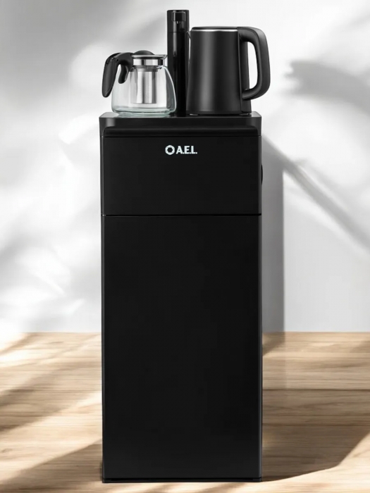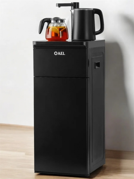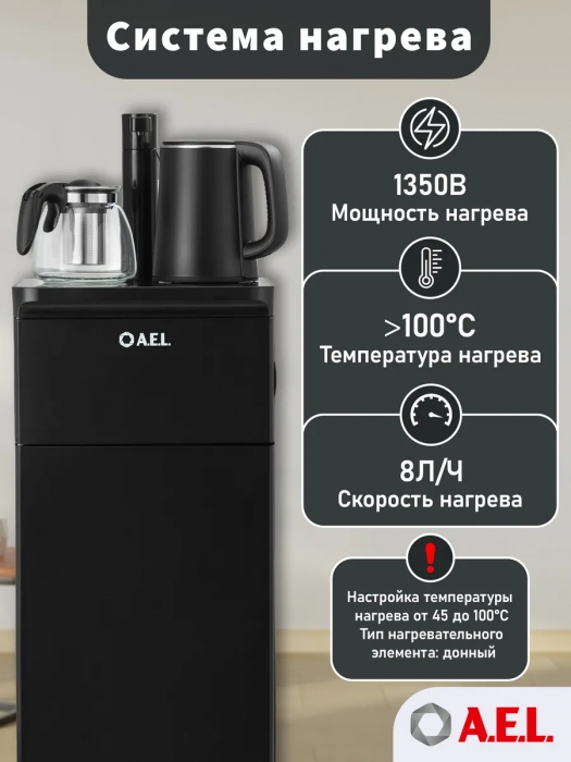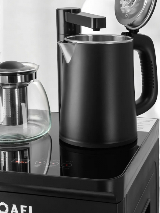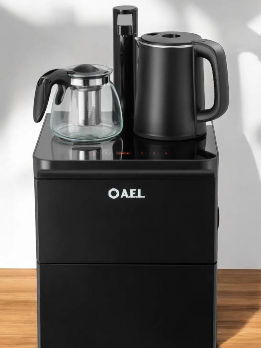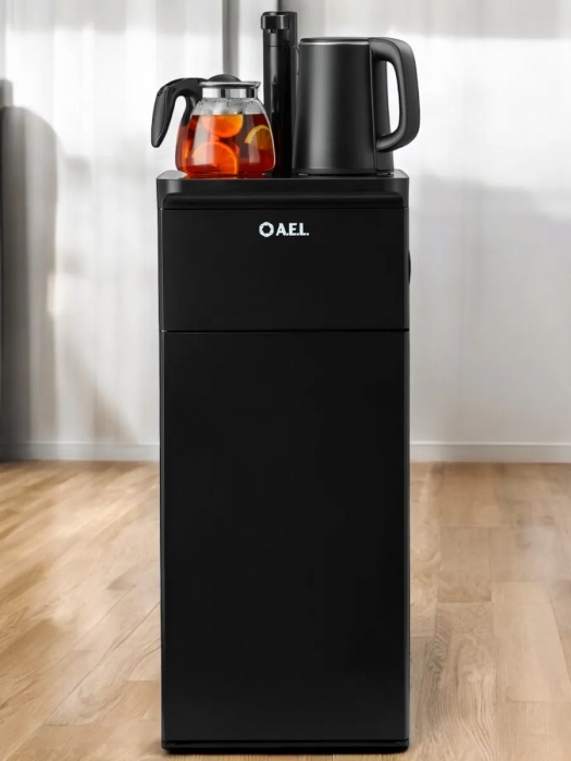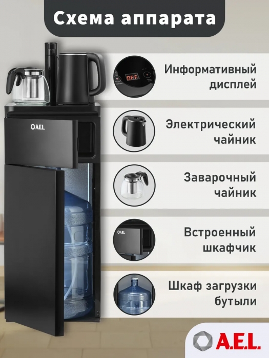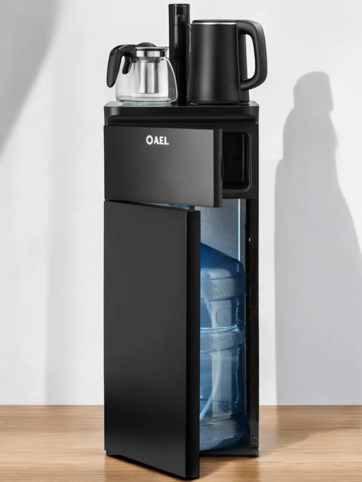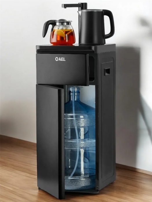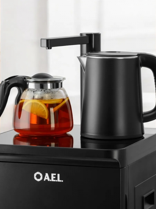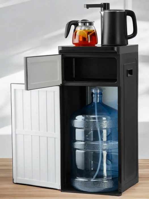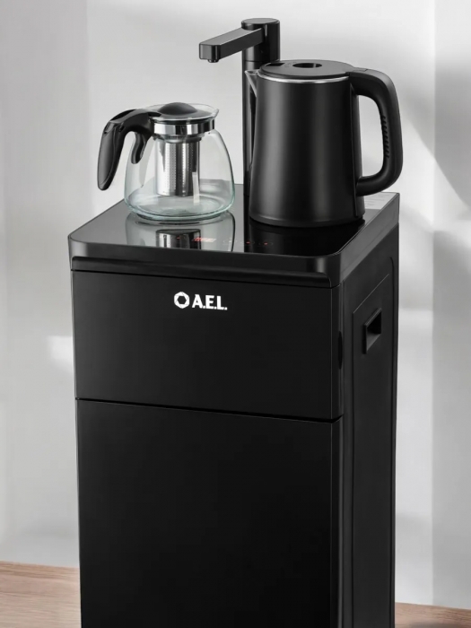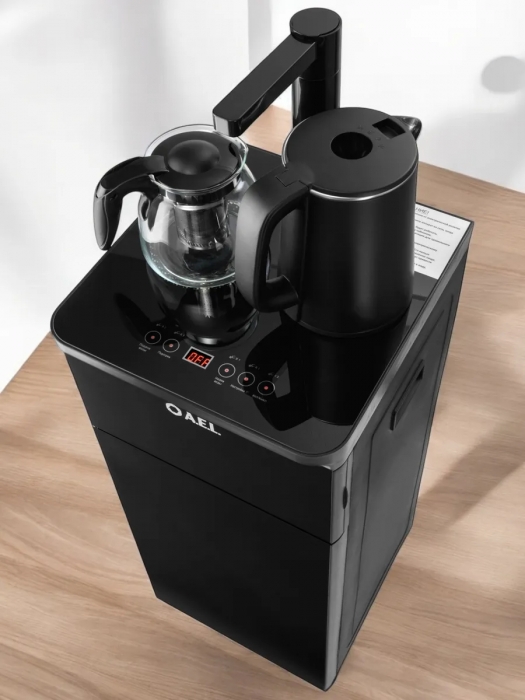 Оригинальное исполнение кулера с нижней загрузкой бутыли и без охлаждения, состоит из заварочного и электрического чайников, сенсорной панели управления и шкафчика для хранения. Яркая световая индикация и информативный дисплей на сенсорной панели сообщат о текущем режиме и подключении к сети. Цвет черный. Объем чайников 1 литр.Рахмер в собранном виде 320 x 310 x 920мм (вкл кран)