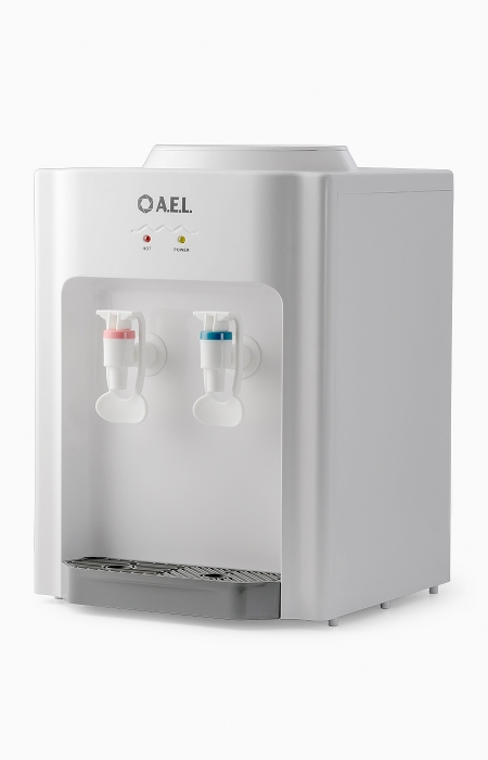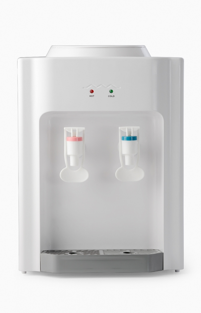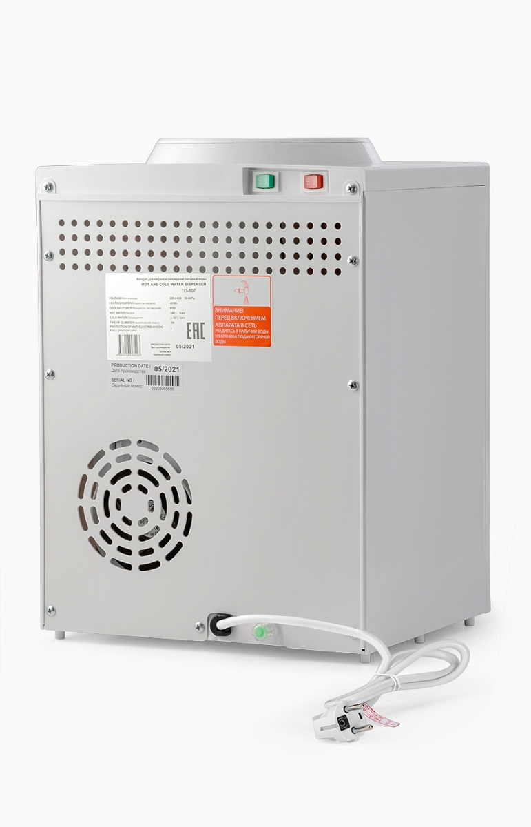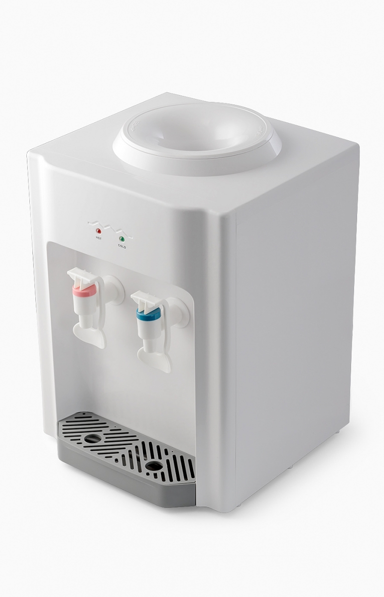 Настольный кулер для воды с электронным охлаждением и верхней загрузкой бутыли. Имеет компактные размеры, благодаря чему легко устанавливается на стол или тумбочку не загромождая пространство. Оснащен двумя механическими кранами типа "нажим чашкой" для подачи горячей и охлажденной воды. Для включения/отключения нагрева или охлаждения на задней стенке корпуса расположены специальные тумблеры. Корпус изготовлен из высококачественного пищевого пластика. Кулер подходит как для домашнего, так и для офисного использования, на предприятиях и учреждениях.