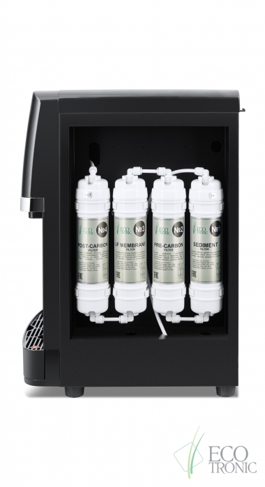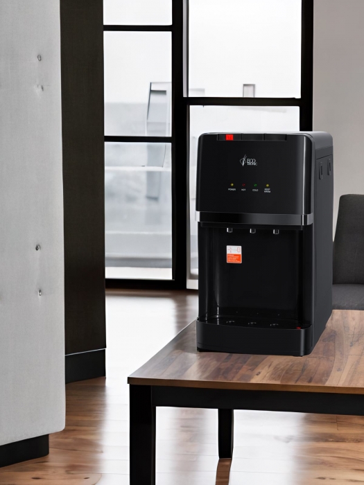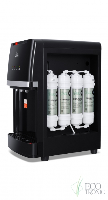 Пурифайер настольного типа с ультрафильтрационной системой очистки воды. Электронное охлаждение. Стильный дизайн. Три крана типа "клавиши": подачи горячей воды с защитой от детей, холодной воды и подачи воды комнатной температуры из бутыли. Индикация работы пурифайера, нагрева и охлаждения воды.