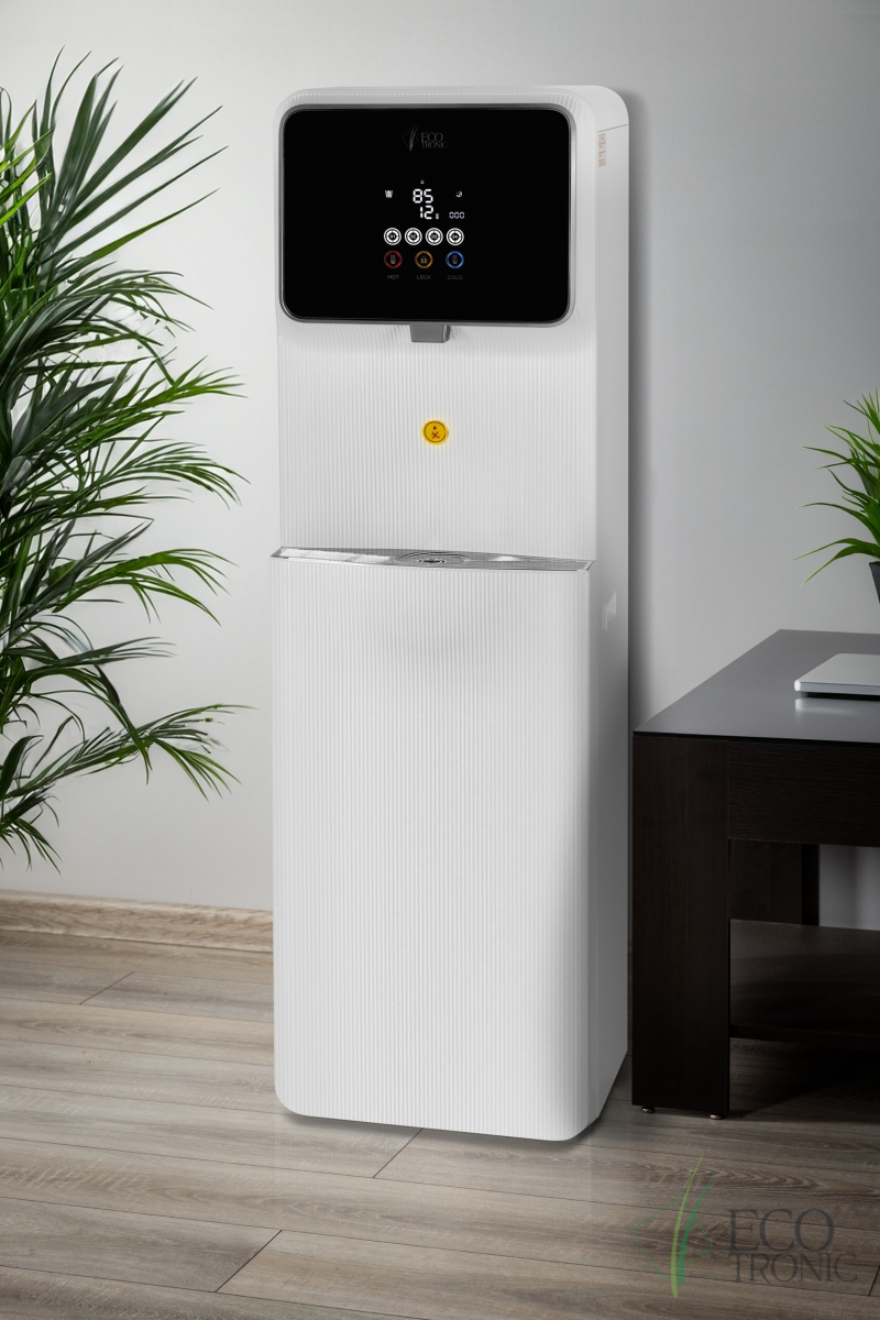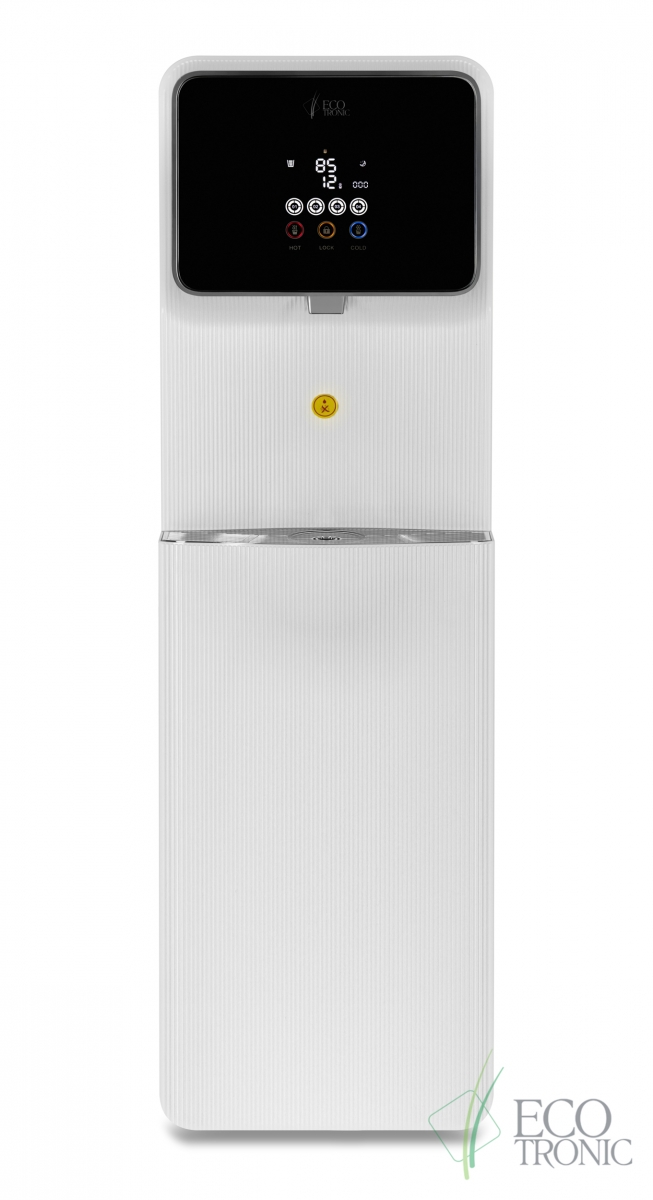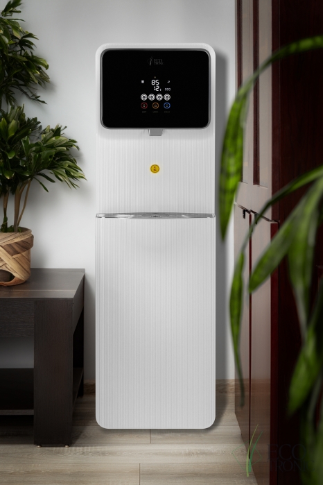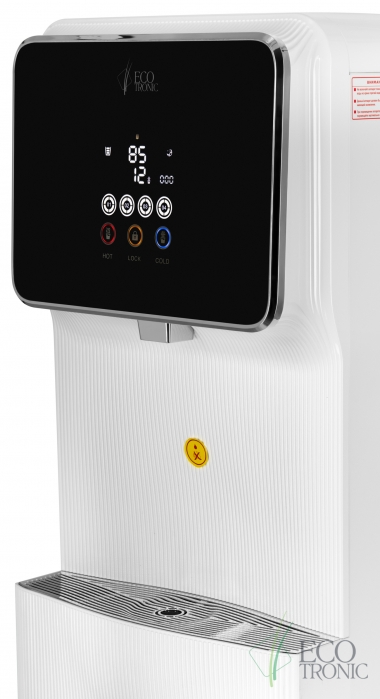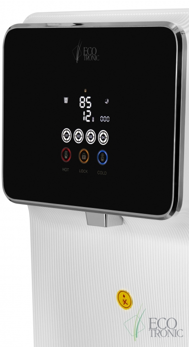 Пурифайер с исключительно большой производительностью - вместительный бак горячей воды (9л.) и совмещенный с накопительным бак холодной воды (23л.). Сенсорная панель управления с LED-дисплеем, на котором выводится температура горячей и холодной воды, индикация работы аппарата и срока службы фильтров. На панели управления также расположены сенсорные кнопки подачи горячей и холодной воды и кнопка блокировки случайной подачи горячей воды (защита детей). Подача воды порционно (защита от перелива). При однократном нажатии максимально выдается только ~1л. горячей или ~1,2л. холодной воды. В любой момент подачу воды можно остановить повторным нажатием.