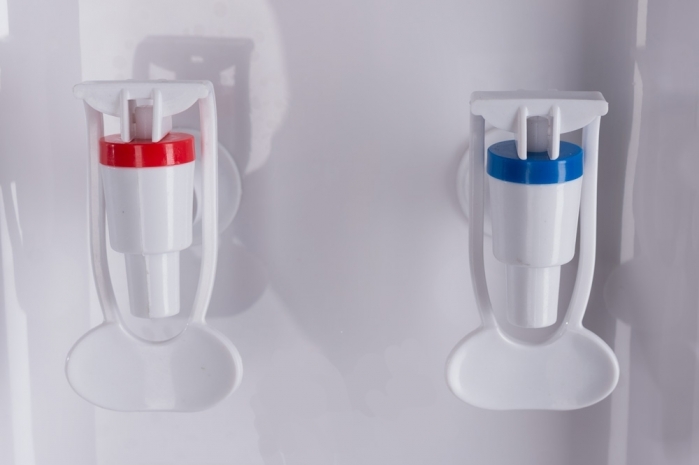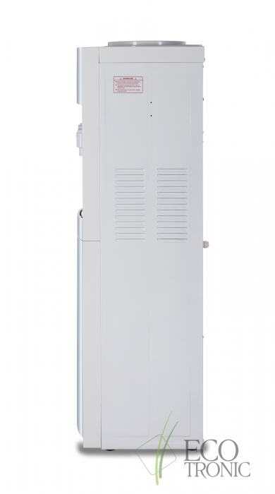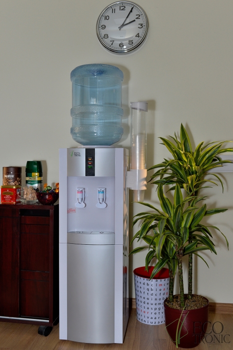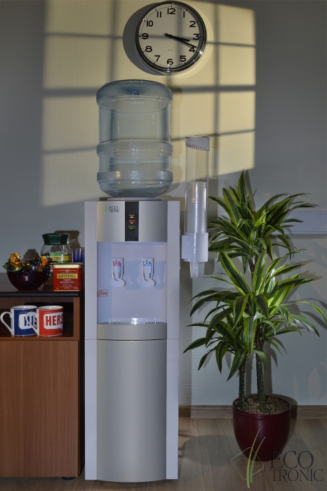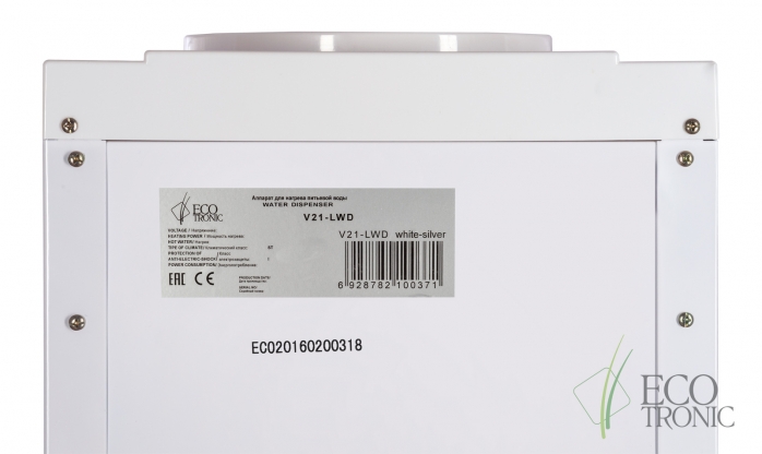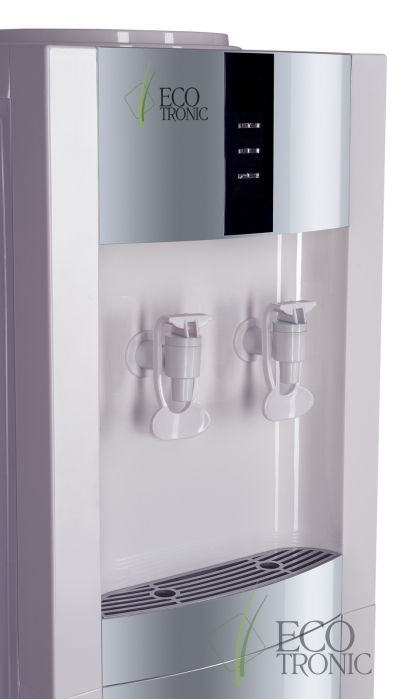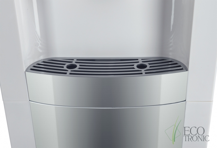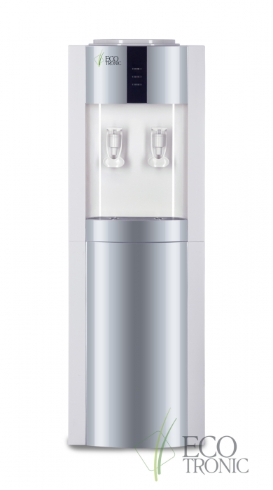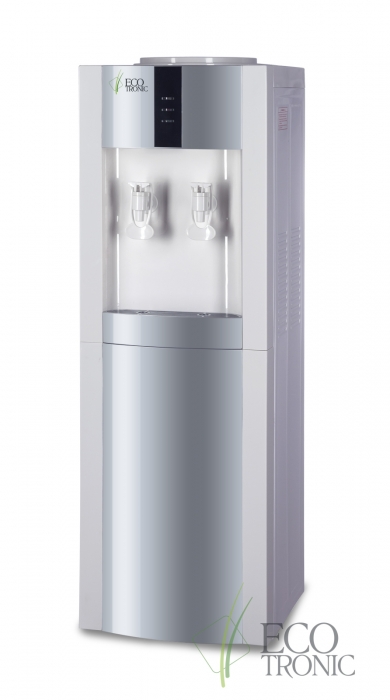 Раздатчик воды Ecotronic V21-LWD white+silver. Бюджетный вариант напольного раздатчика воды, без нагрева и охлаждения. Цвет белый с серебристой вставкой. Тип кранов подачи воды - "Нажим кружкой".