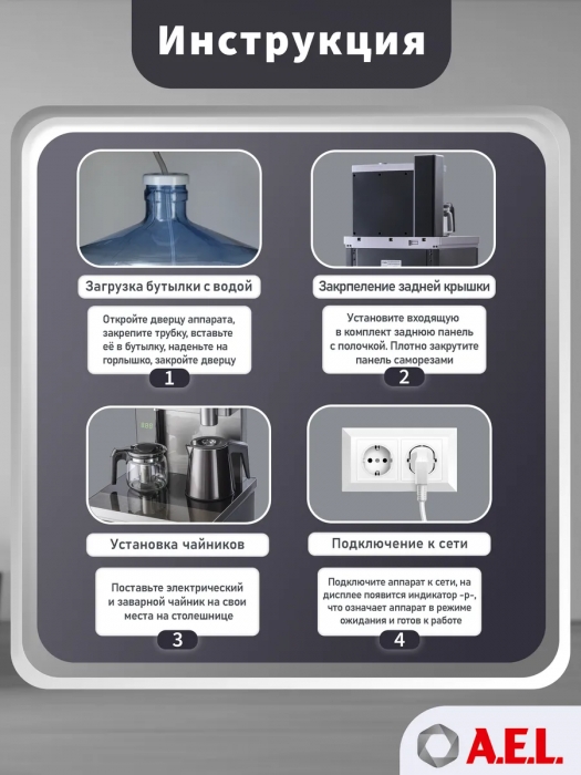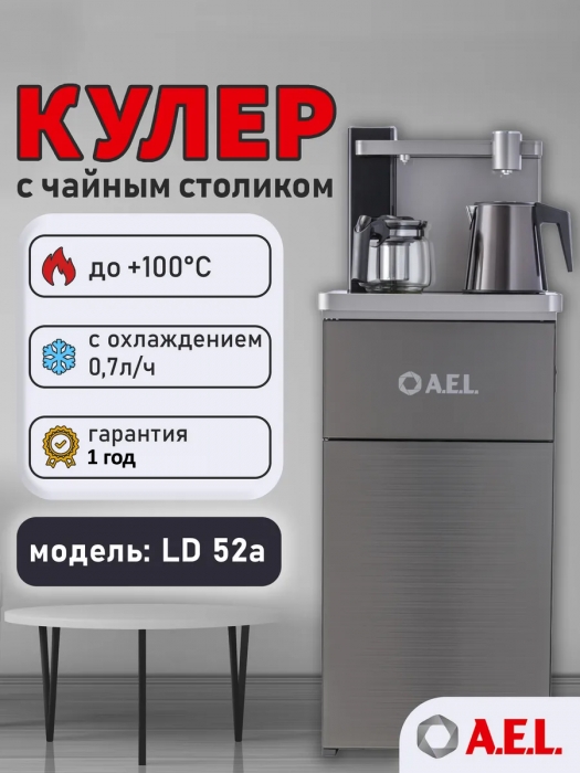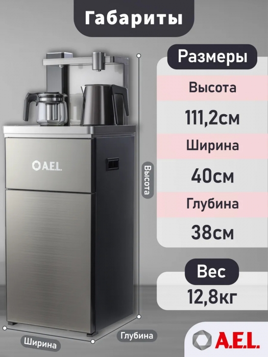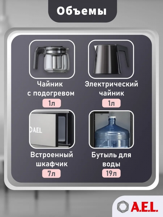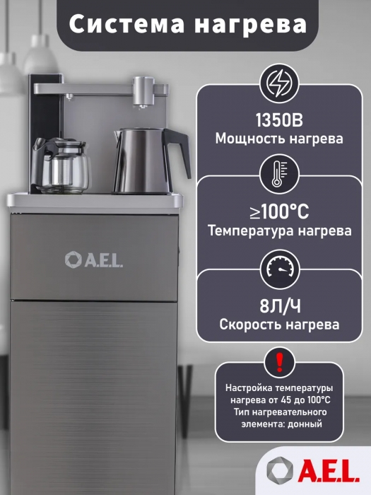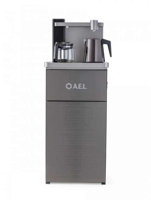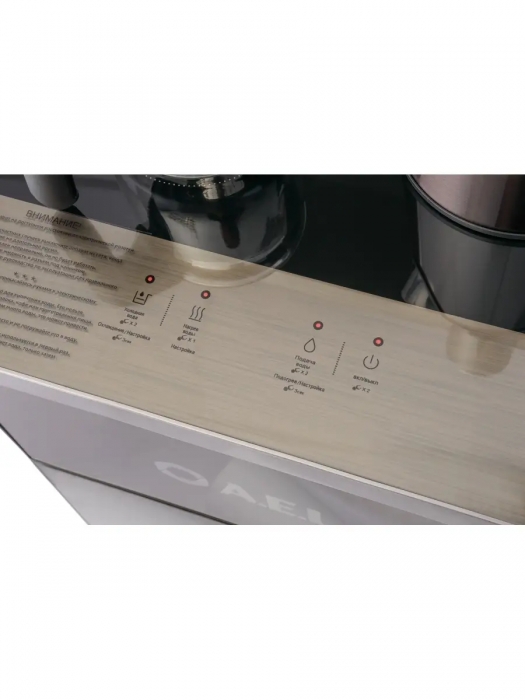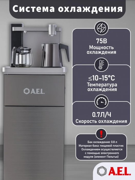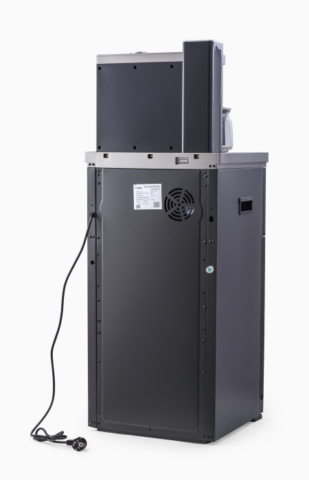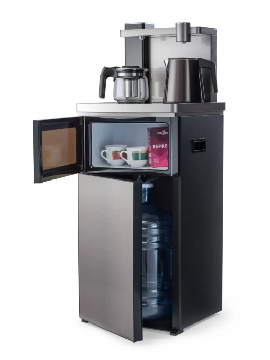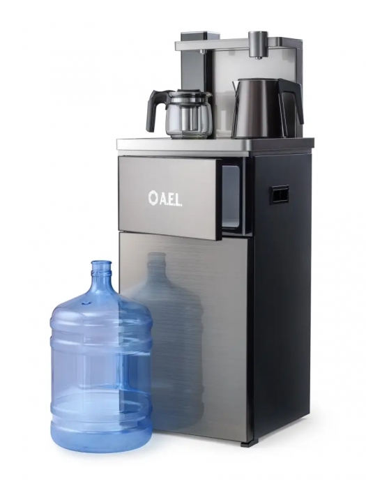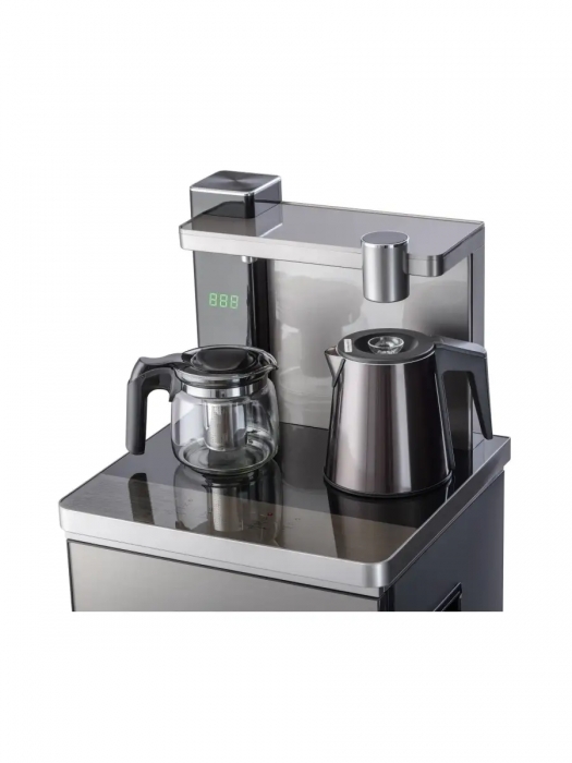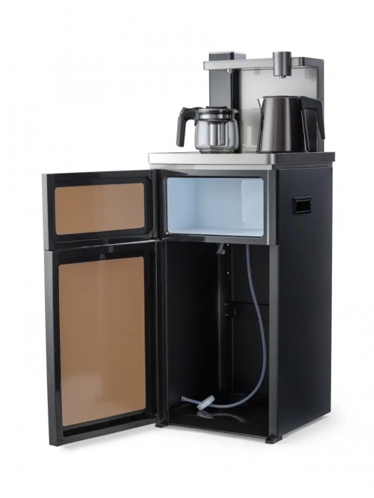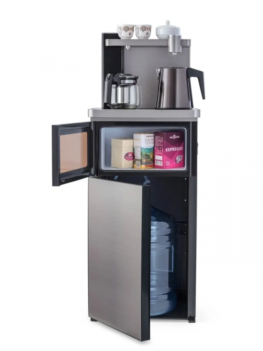 Оригинальное исполнение кулера с нижней загрузкой бутыли с электронным охлаждением. Состоит из заварочного и электрического чайников, сенсорной панели управления, полочки для чашек, шкафчика для хранения. Яркая световая индикация и информативный дисплей на панели сообщат о текущем температурном режиме и подключении к сети.
