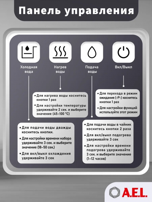 - Настроить время подогрева воды в заварном чайнике в диапазоне от 01 до 12 часов.
