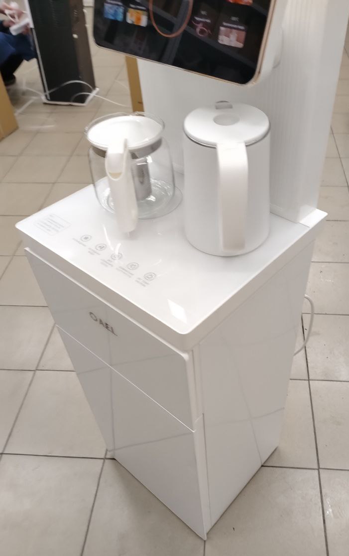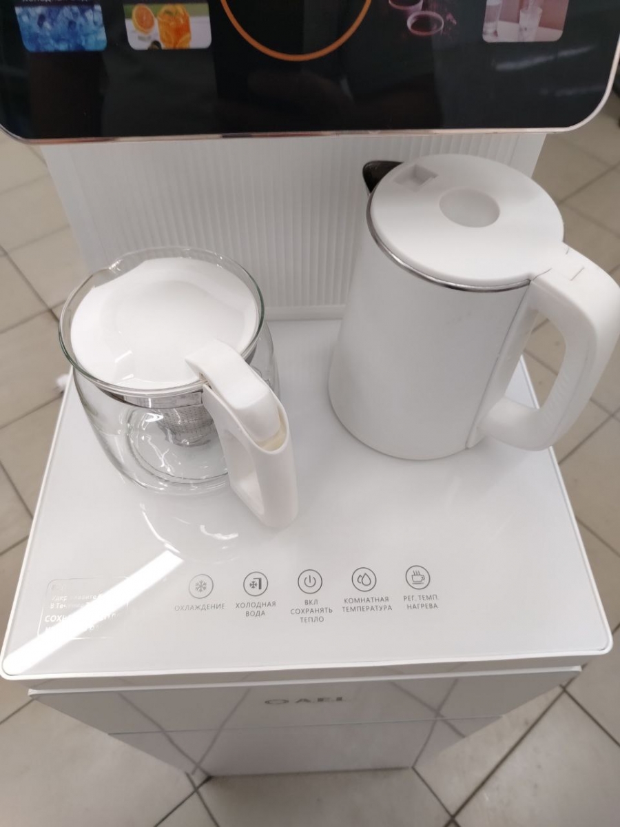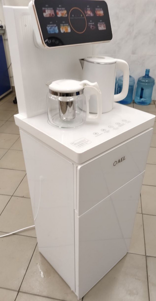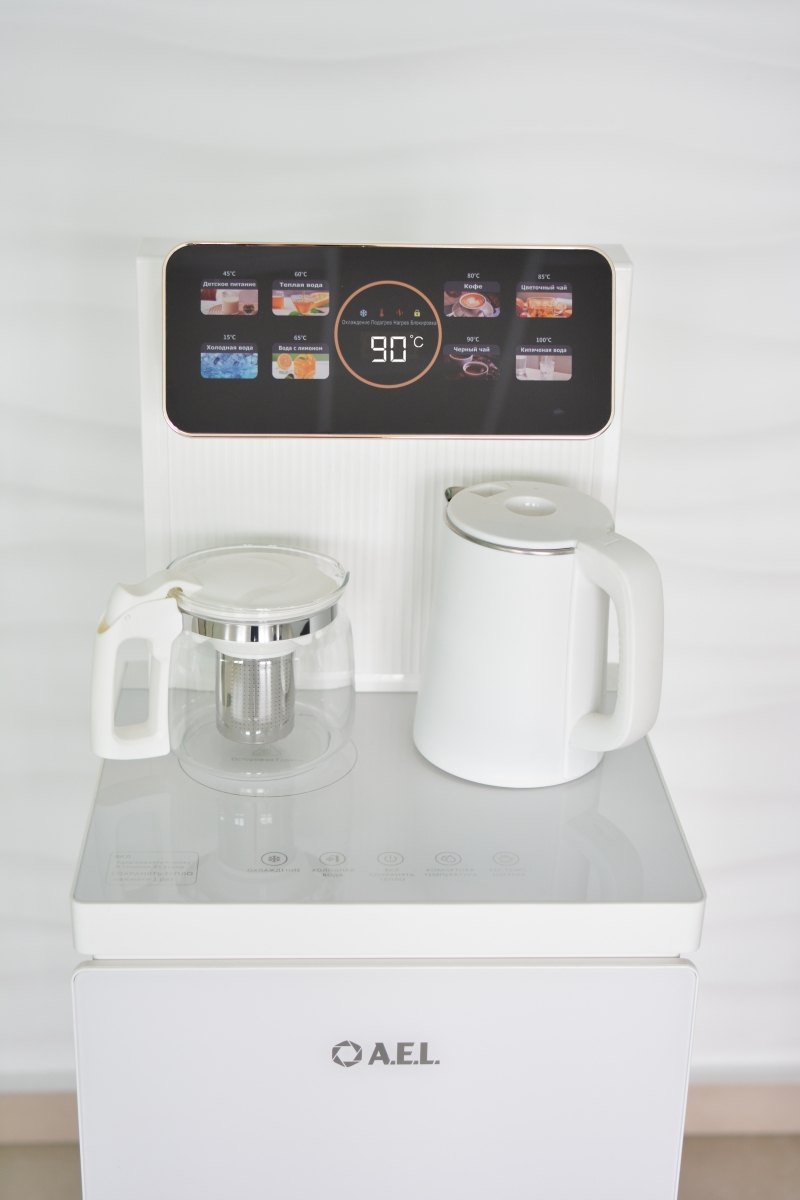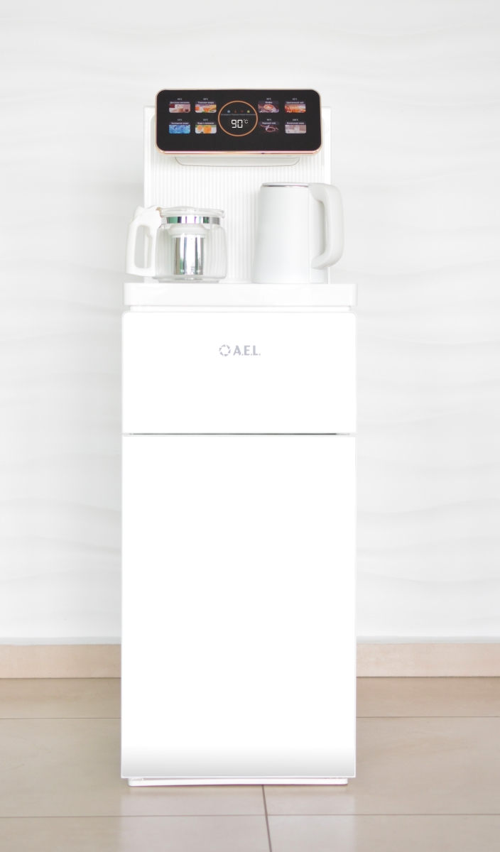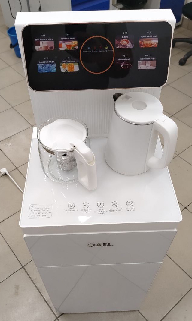 Оригинальное исполнение кулера с нижней загрузкой бутыли и с электронным охлаждением, состоит из заварочного и электрического чайников, сенсорной панели управления и шкафчика для хранения. Яркая световая индикация и информативный дисплей сообщат о текущем режиме и подключении к сети. Цвет белый. Объем чайников 1 литр. Размер в собранном виде 370 x 355 x 1160 мм.