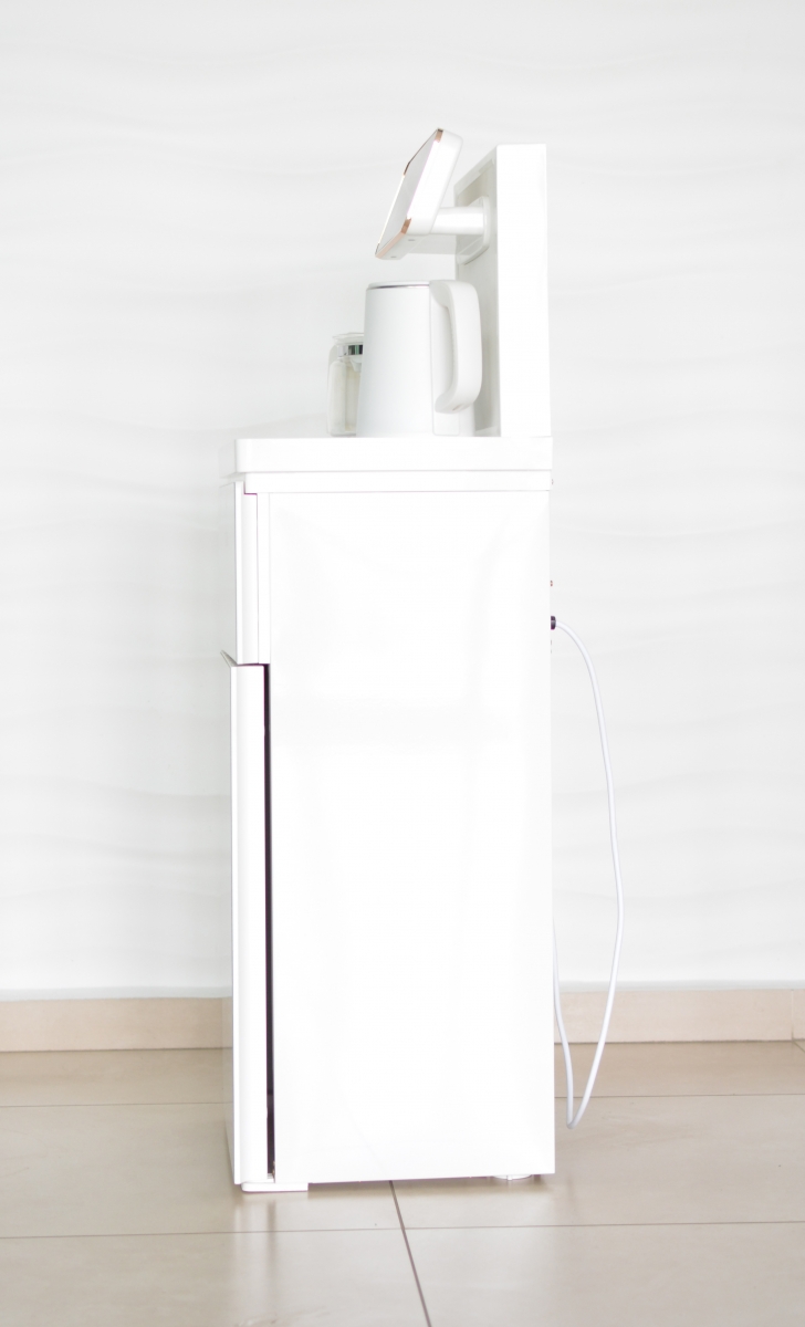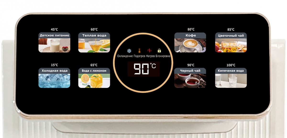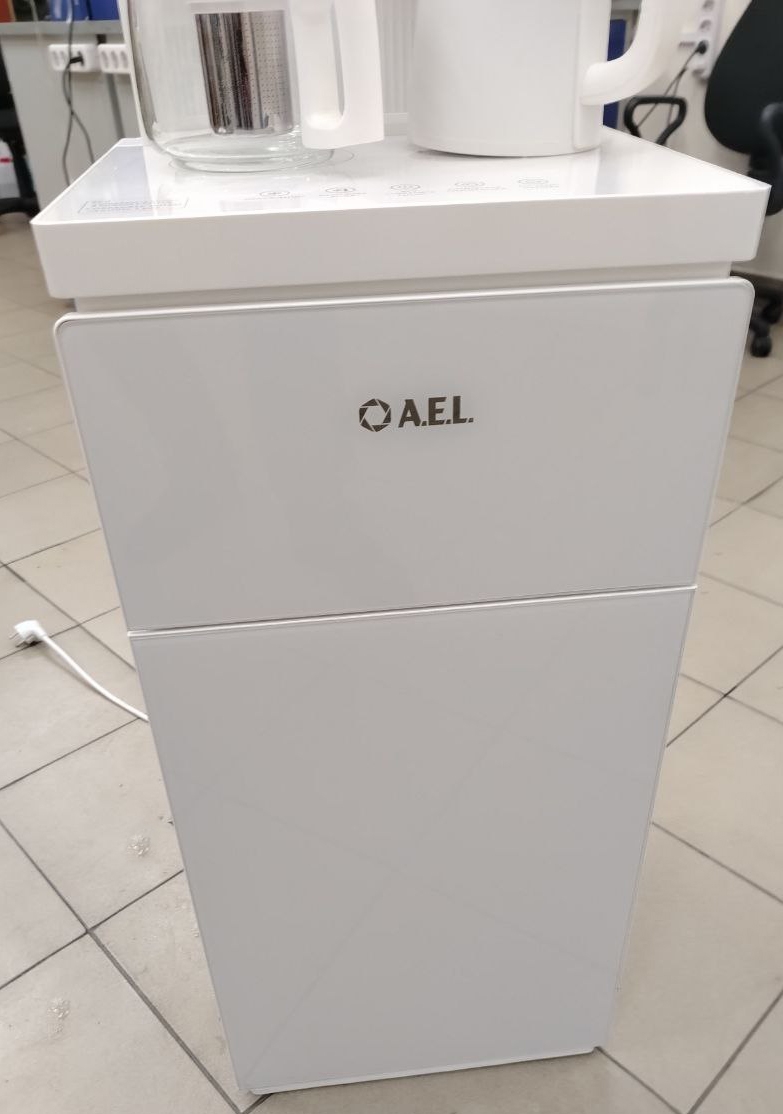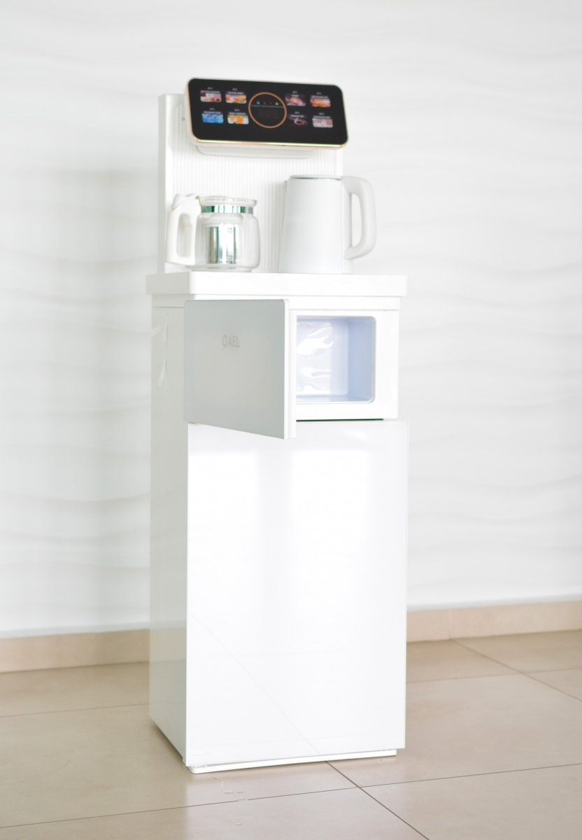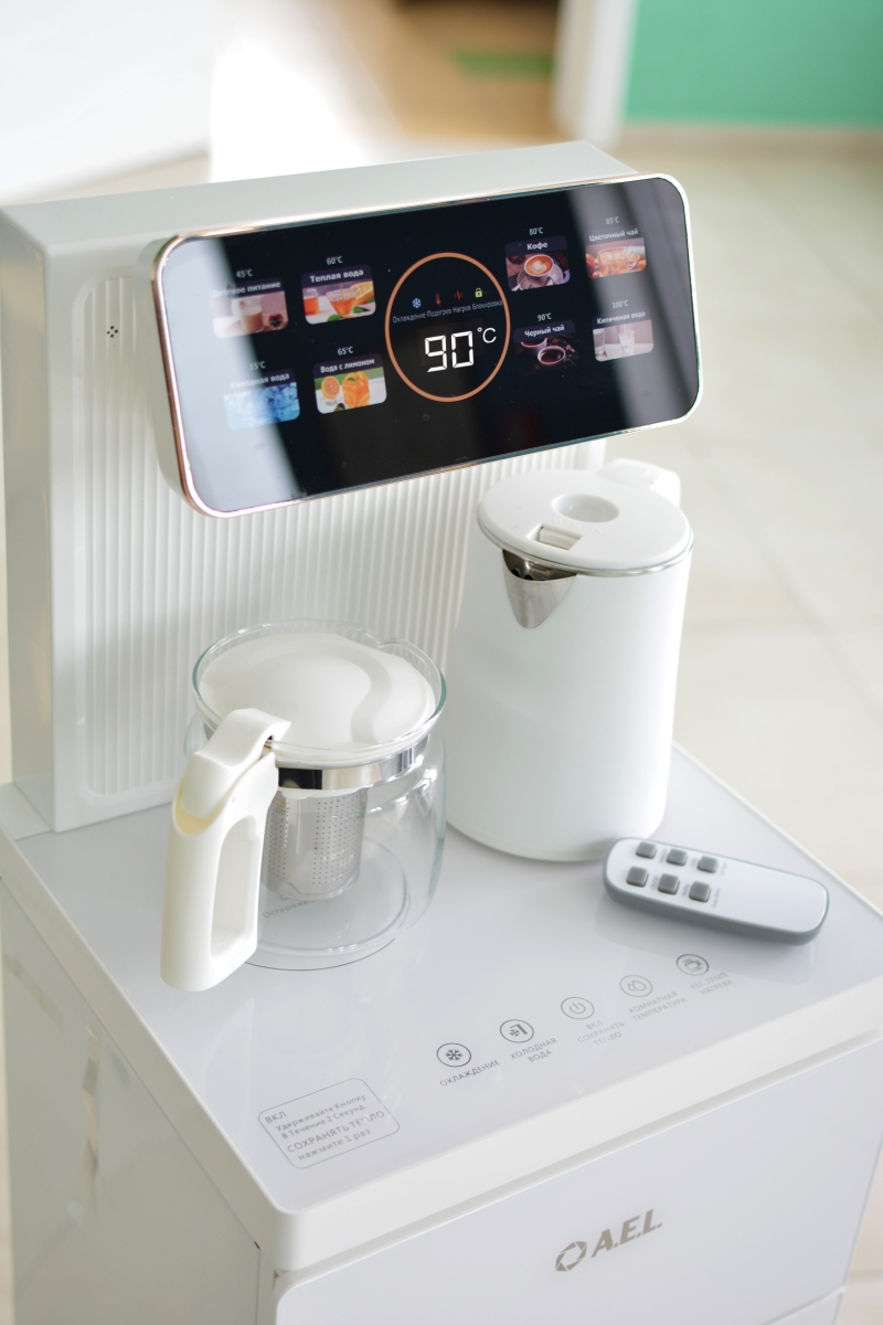 Оригинальное исполнение кулера с нижней загрузкой бутыли и с электронным охлаждением, состоит из заварочного и электрического чайников, сенсорной панели управления и шкафчика для хранения. Яркая световая индикация и информативный дисплей сообщат о текущем режиме и подключении к сети. Цвет белый. Объем чайников 1 литр. Размер в собранном виде 370 x 355 x 1160 мм.