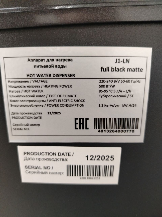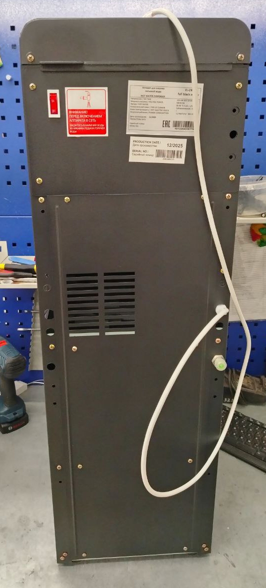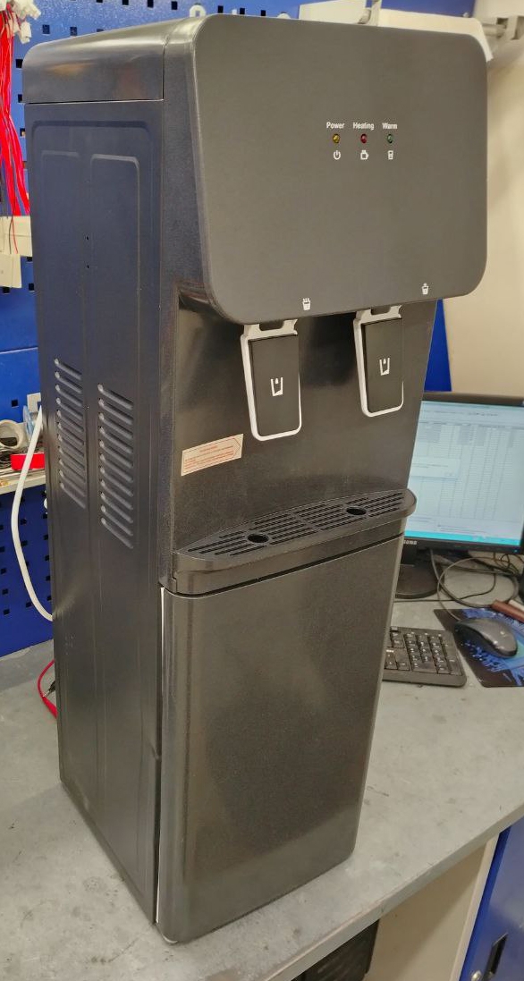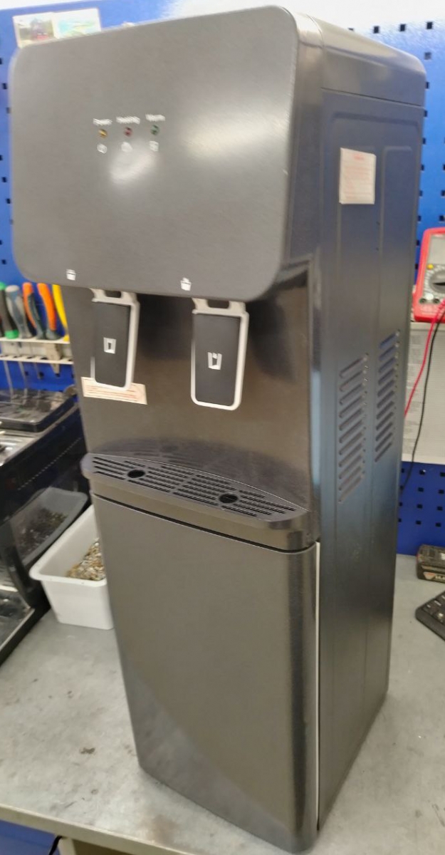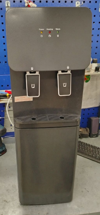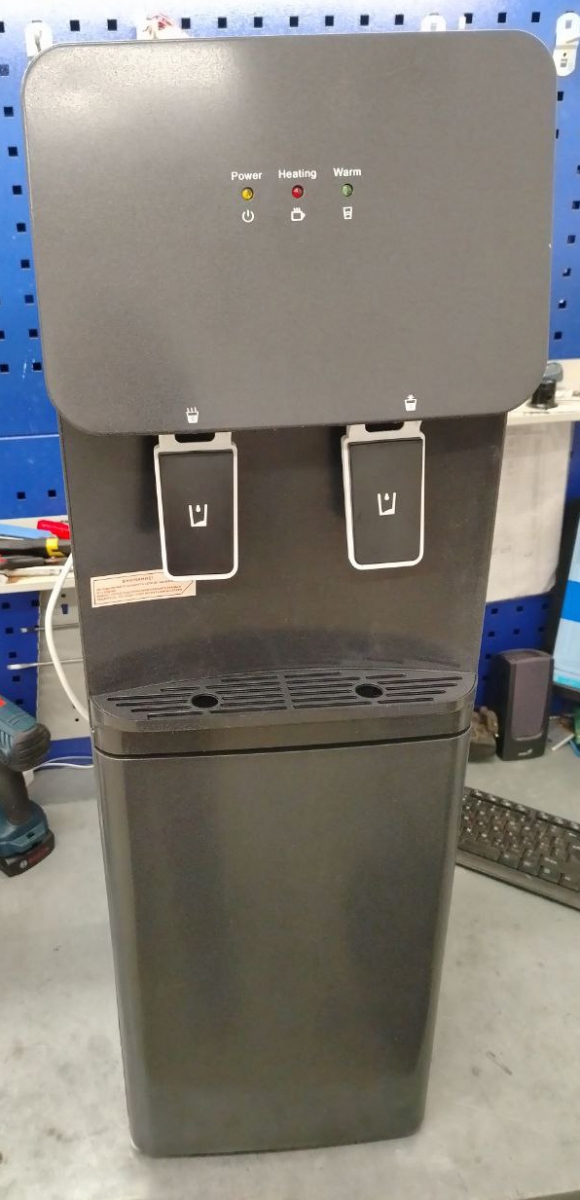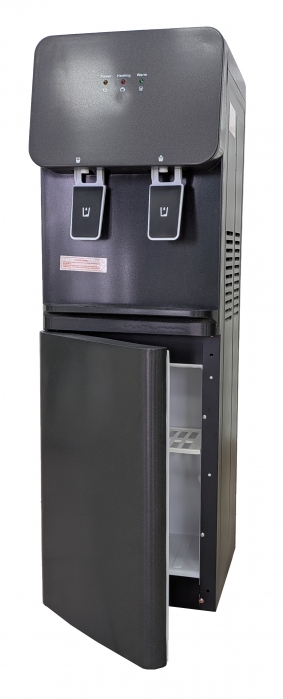 Корпус кулера матовый черного цвета. Компактный кулер для воды без охлаждения, только нагрев. С небольшим шкафчиком в нижней части. Корпус черного цвета с белой вставкой в области кранов подачи воды. Индикация режимов работы, нагрева и готовности воды. Краны «нажим кружкой».