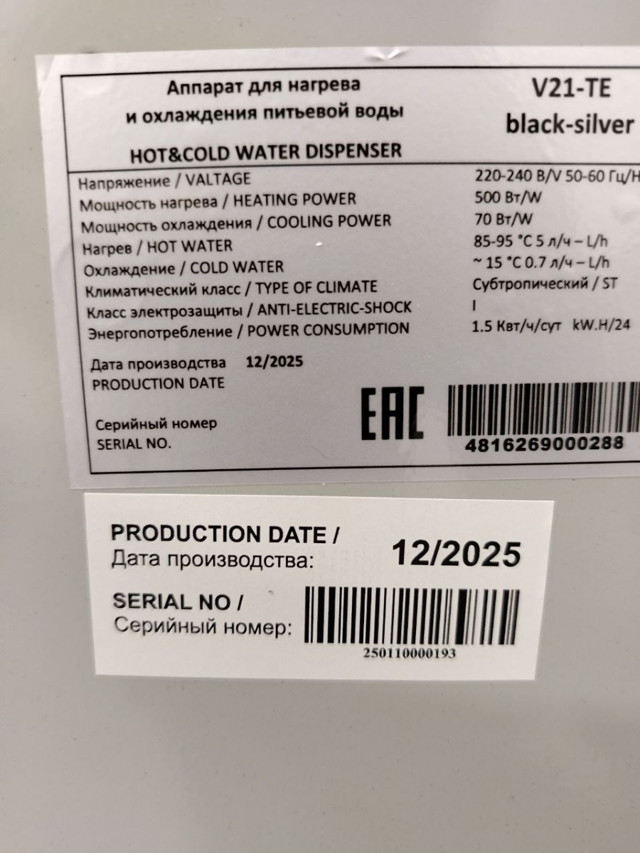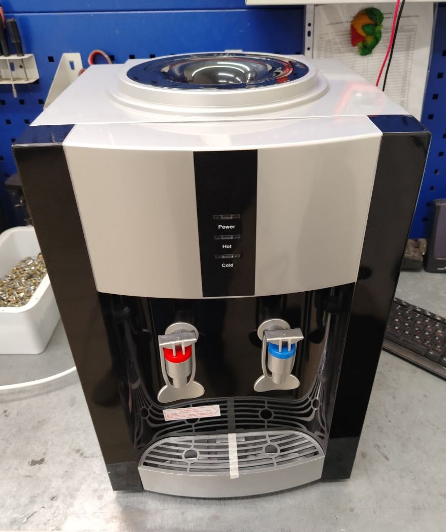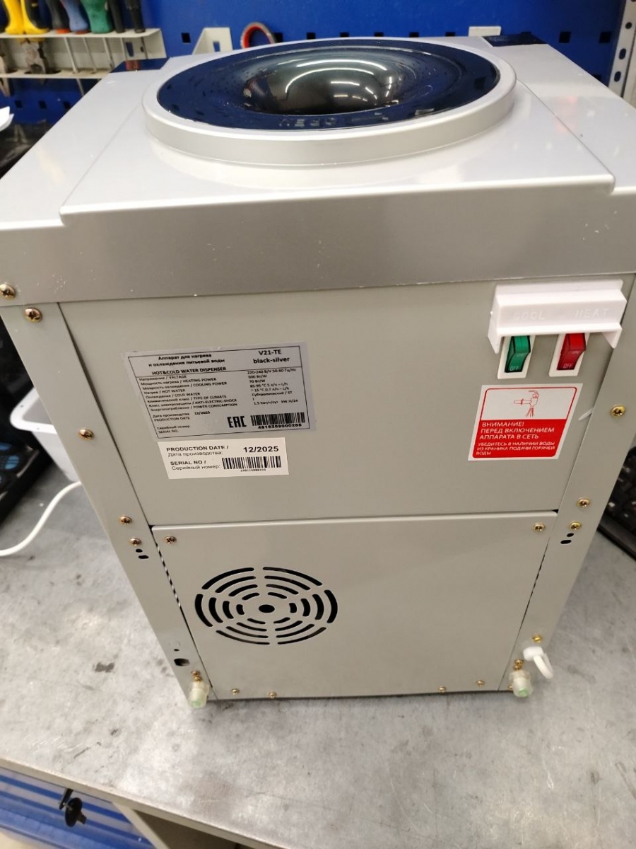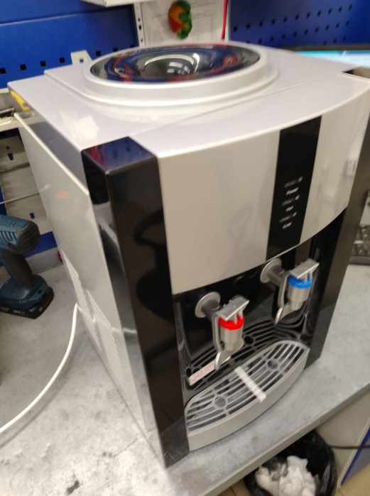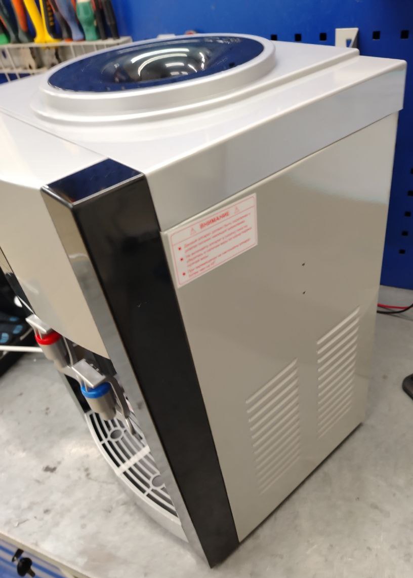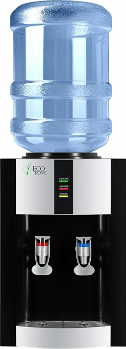 Настольный кулер с электронным охлаждением, цвет черный с серебристой вставкой. Тип кранов подачи воды - "Нажим кружкой". Одинарный блок охлаждения.
