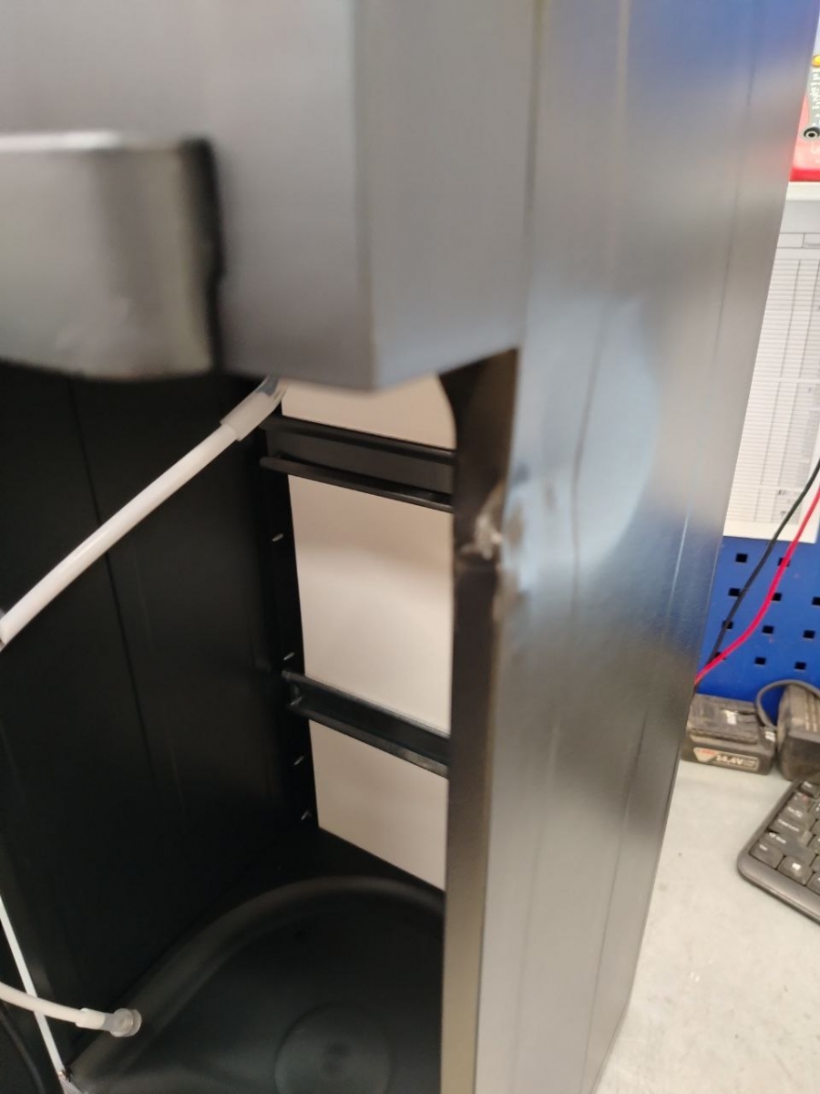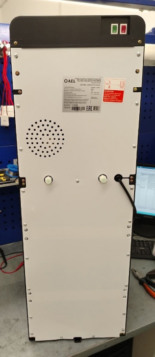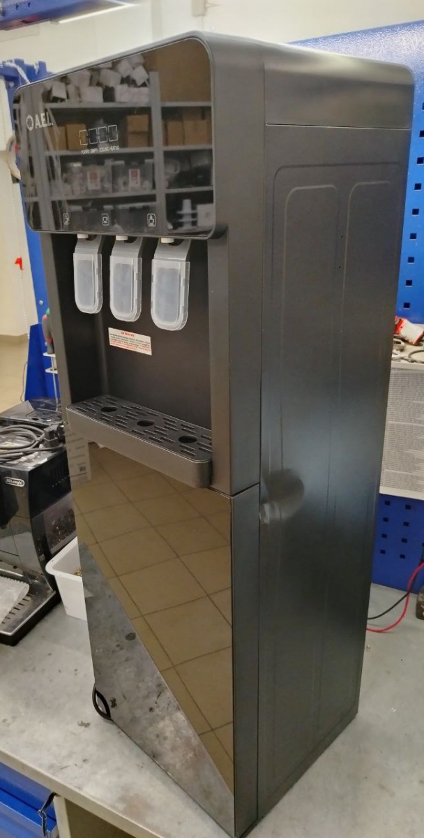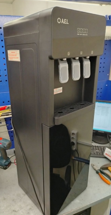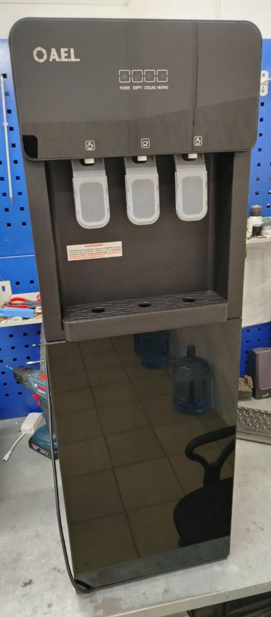 Кулер для воды с нижней загрузкой бутыли и с электронным охлаждением. Три крана нажим чашкой. Горячая/прохладная/холодная вода на выходе.