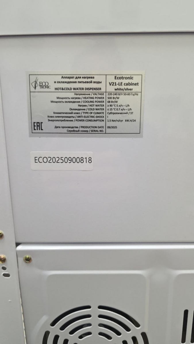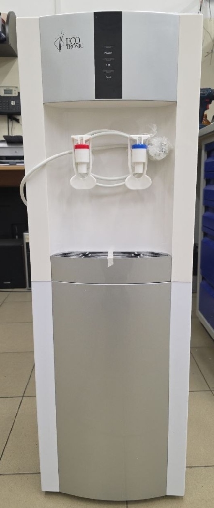 Кулер Ecotronic V21-LE white-silver. Напольный кулер с электронным охлаждением и шкафчиком.Тип кранов подачи воды - "Нажим кружкой". Одинарный блок охлаждения.